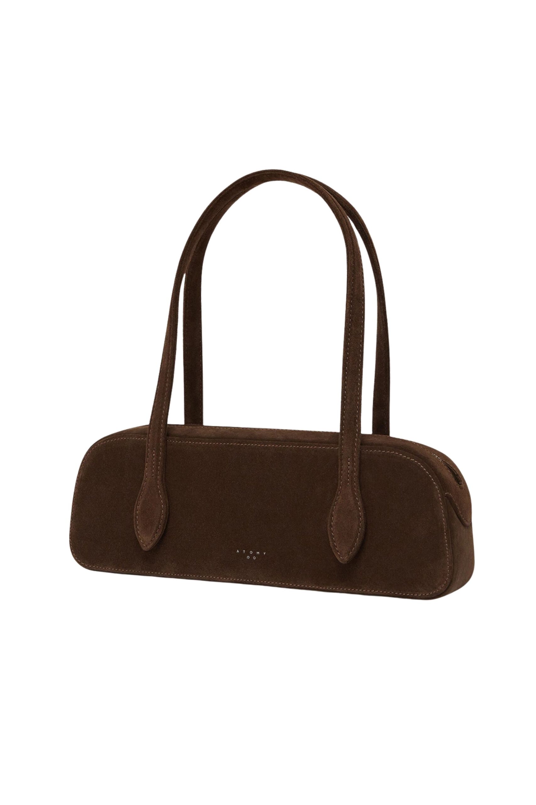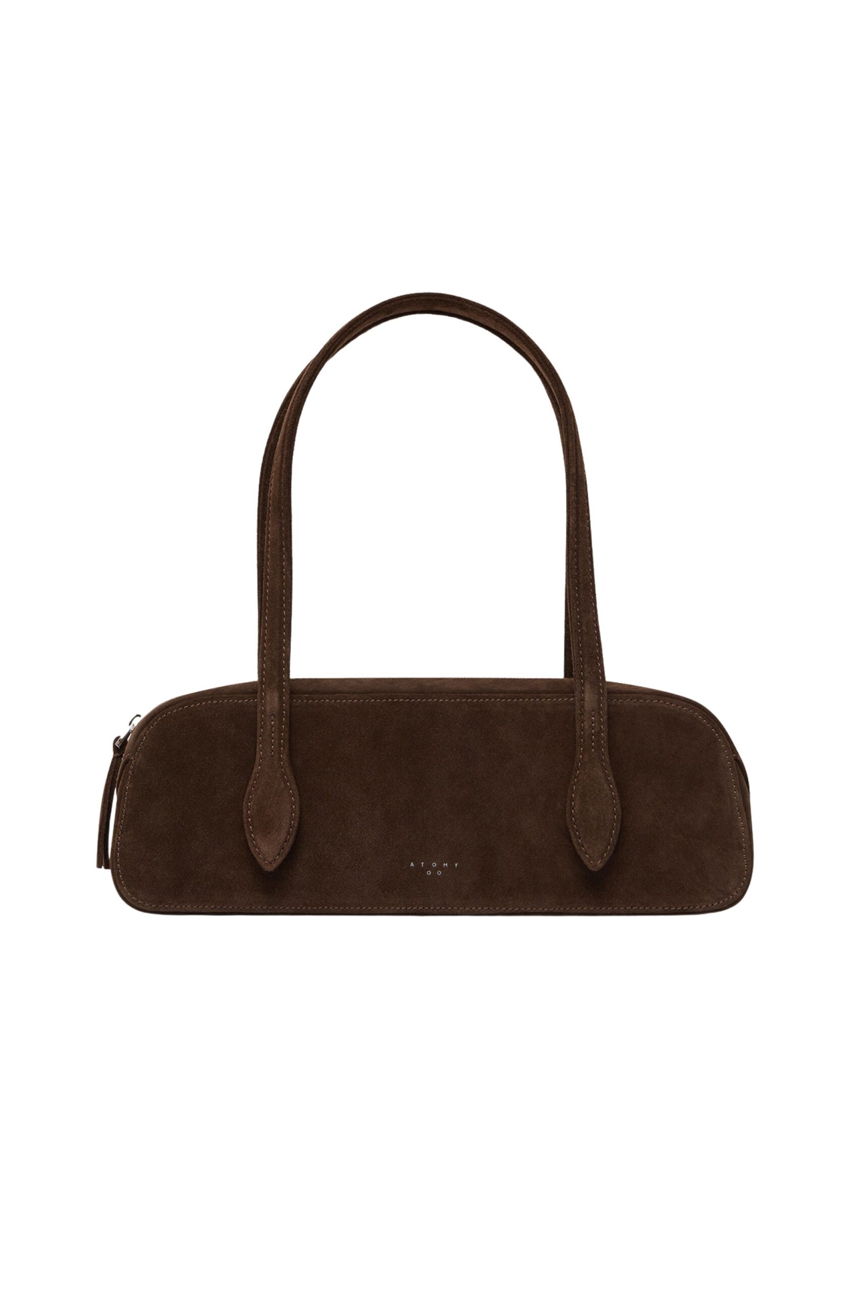 Atom Linda is a baguette-style shoulder bag made of chocolate suede, crafted in a local leather workshop – a true challenge for the artisans. Long handles allow it to be carried comfortably in hand or over the shoulder. This model will fit all your small essentials and add character to any outfit. Inside, there is a single zippered compartment, fully lined with cotton. The front features an embossed brand logo.