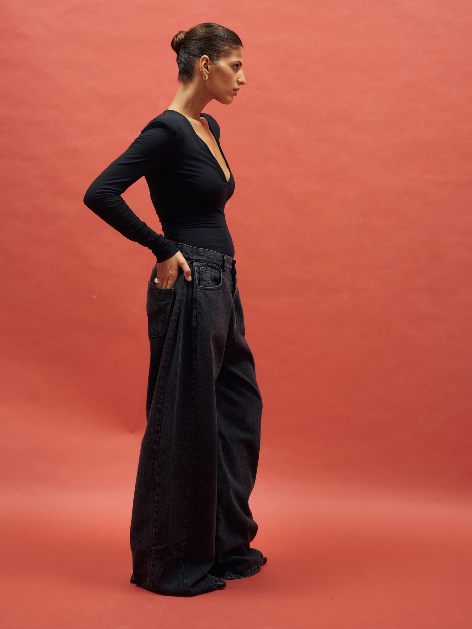 Dopasowane body z długim rękawem i głębokim dekoltem w kształcie litery V. Zmysłowo podkreśla ciało, a poduszki na ramionach nadają całości eleganckiego charakteru. To propozycja, która świetnie prezentuje się w połączeniu ze skórzanymi spodniami, spódnicą czy luźnymi jeansami. Proste, minimalistyczne, ale z charakterem – wystarczy dodać ulubioną biżuterię i dodatki.