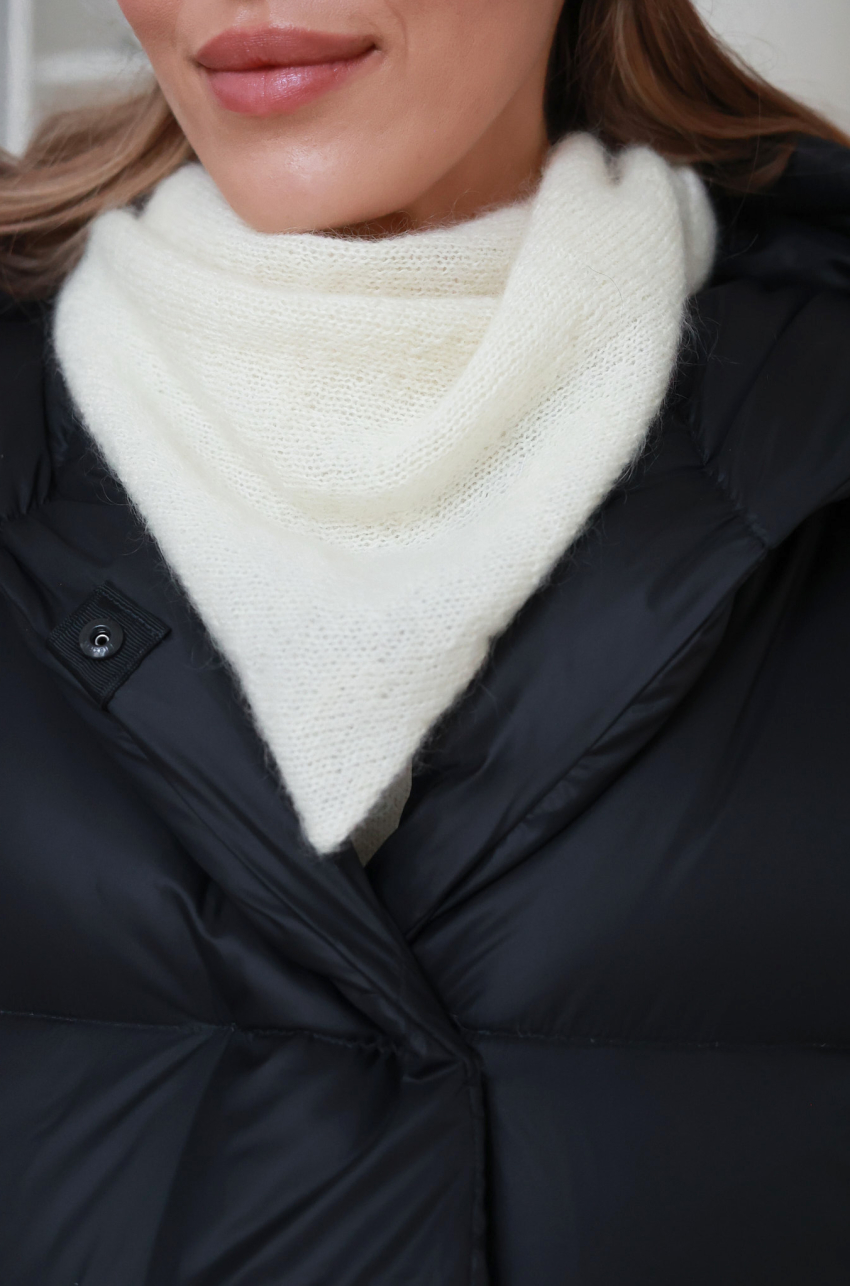 Trójkątna chusta dzianinowa wykonana w 65% z przędzy super kid mohair. Może służyć jako zawiązywana pod brodą chusta na głowę lub jako alternatywa dla szalika. Miękka i puszysta, ponieważ przędza super kid mohair ma widoczny lśniący włos, który sprawia, że wykonane z niej dodatki i ubrania pięknie odbijają światło.