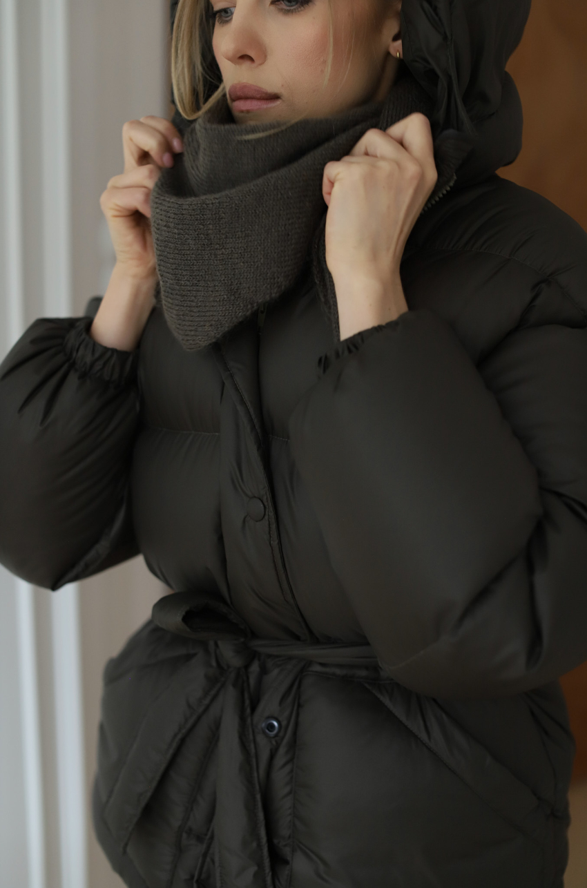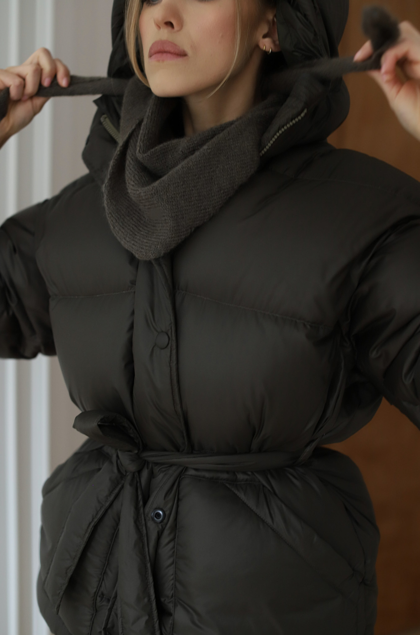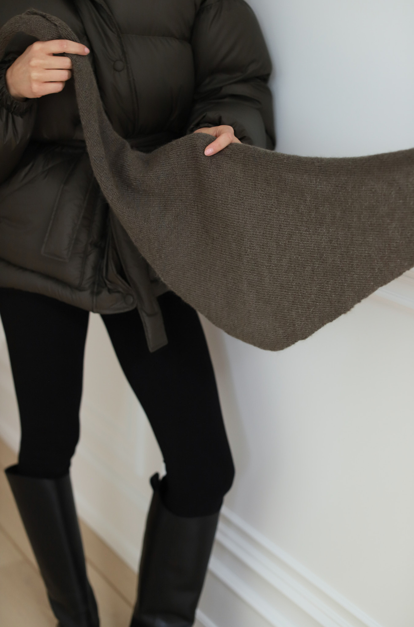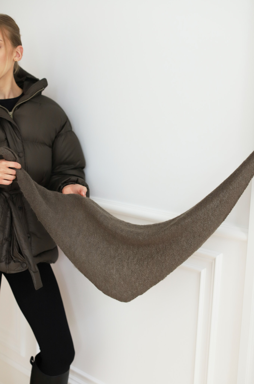 Trójkątna chusta dzianinowa wykonana w 65% z przędzy super kid mohair. Może służyć jako zawiązywana pod brodą chusta na głowę lub jako alternatywa dla szalika. Miękka i puszysta, ponieważ przędza super kid mohair ma widoczny lśniący włos, który sprawia, że wykonane z niej dodatki i ubrania pięknie odbijają światło.