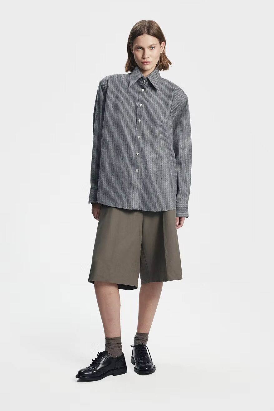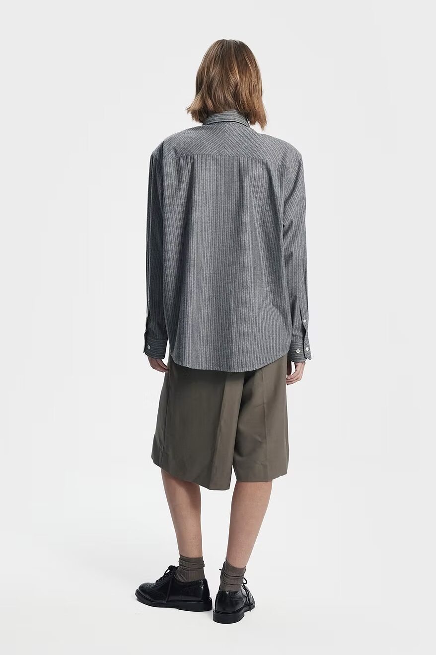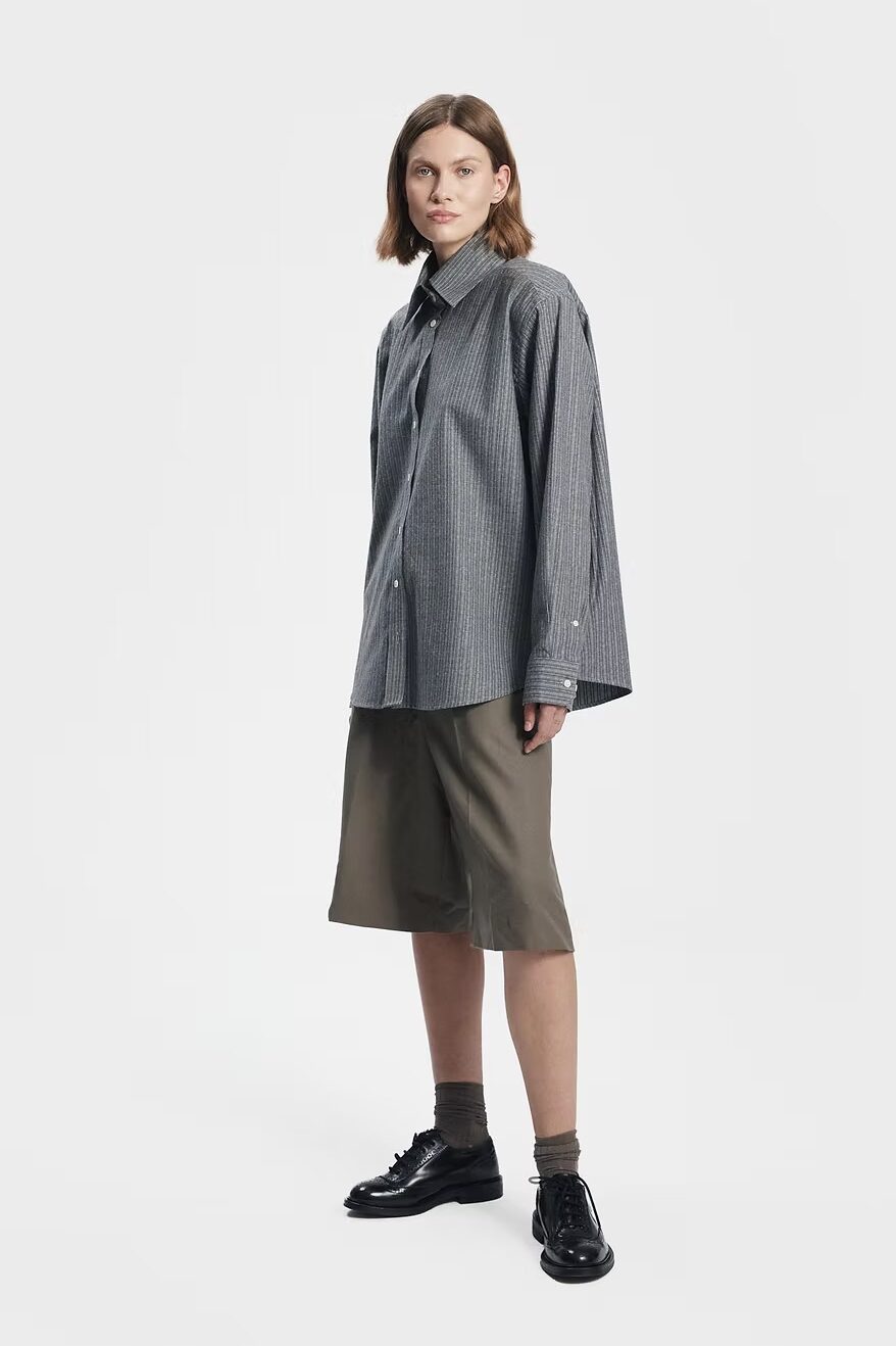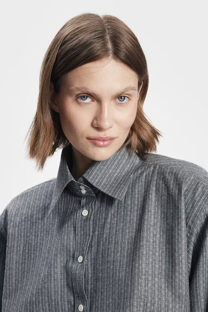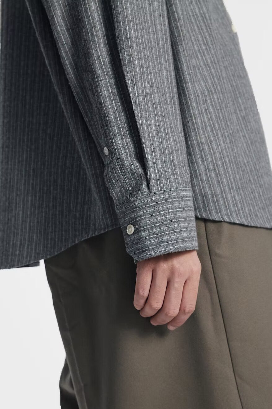 DUSTY BIG BOY to klasyczna forma z modowym twistem – koszula o prostym, pudełkowym kroju, uszyta z przyjemnej mieszanki: bawełny, wiskozy i wełny merino. Subtelny pasiak w przygaszonych, grafitowo-miętowych tonach dodaje całości miękkości i charakteru vintage.