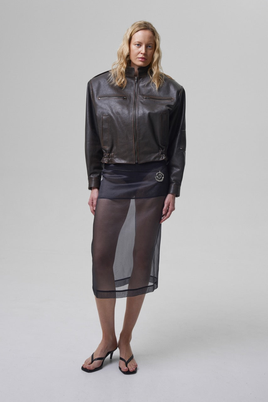 Kurtka GAIETE retro bomber jacket to esencja ponadczasowego stylu. Wykonana z najwyższej jakości, delikatnie postarzonej skóry, zachwyca perfekcyjnym rzemiosłem i dbałością o detale. Strukturalny krój, inspirowany klasyczną modą lotniczą, nadaje jej wyrazistości, podczas gdy subtelne przeszycia i surowe wykończenie dodają charakteru.