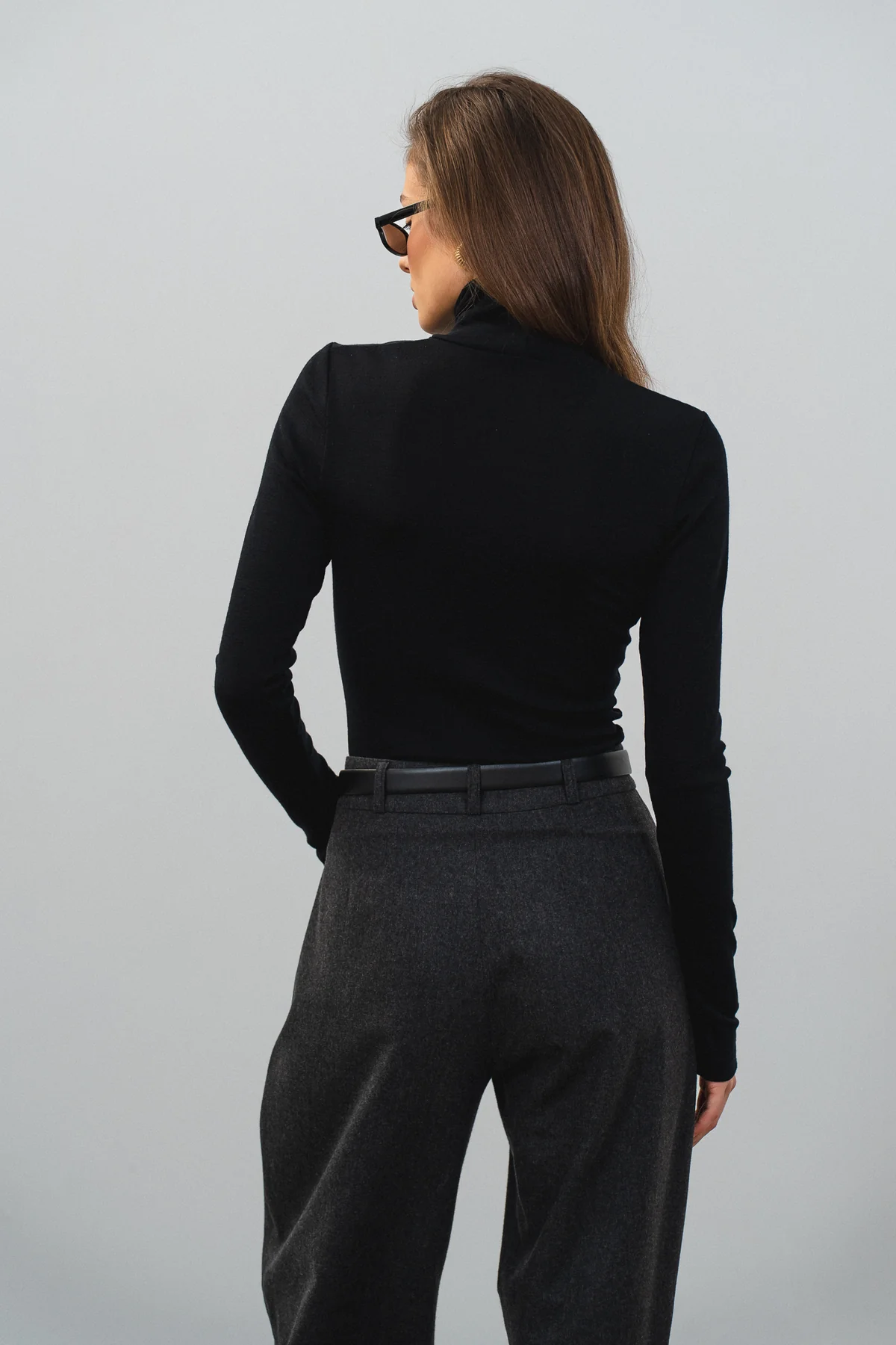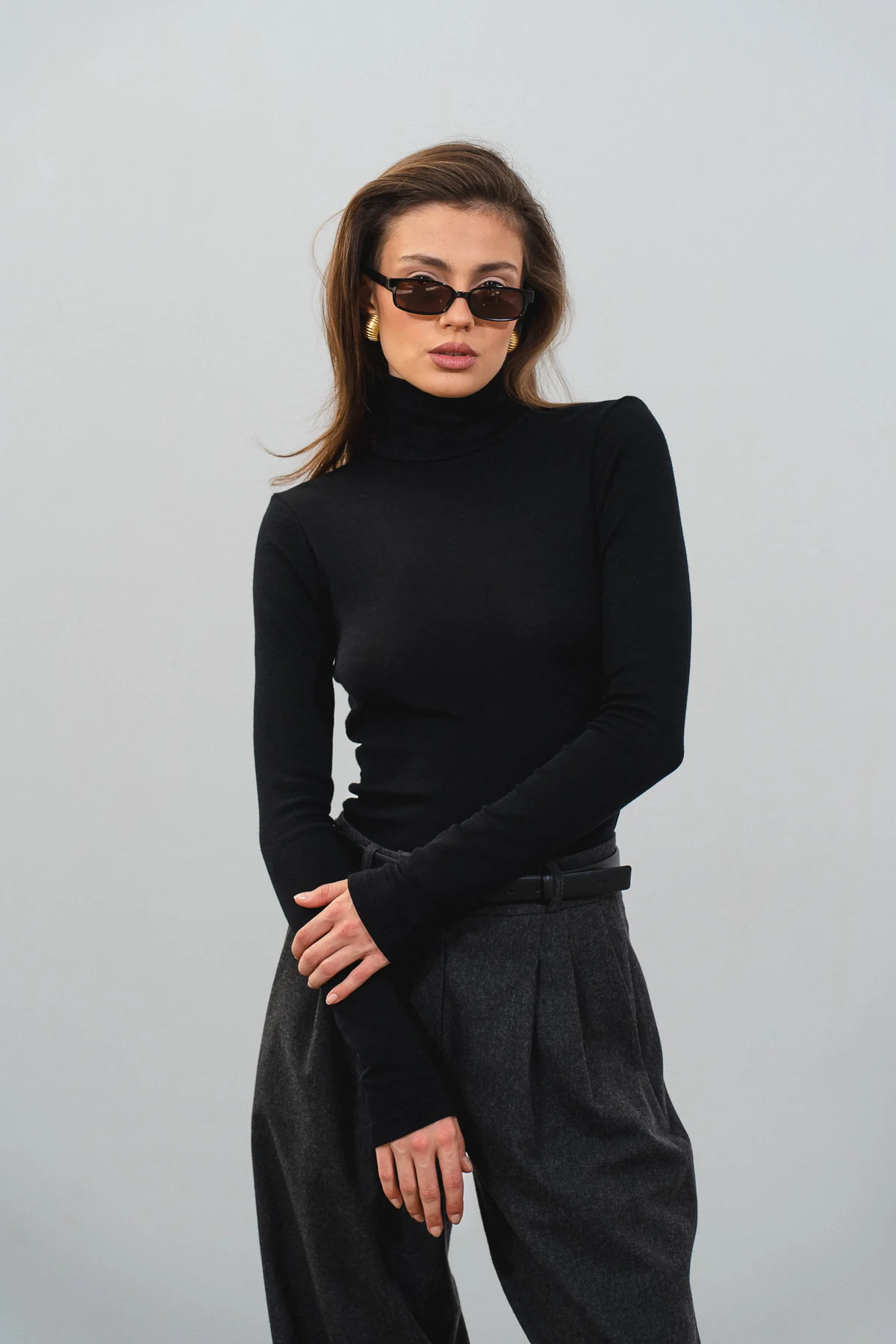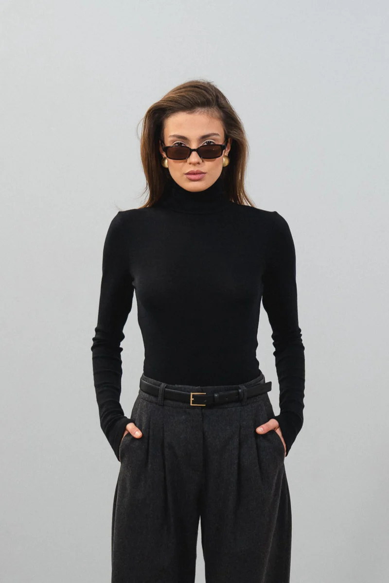 Minimalizm w najczystszej postaci. Klasyczny golf w głębokiej czerni to esencja lat 90. – prostota, która podkreśla sylwetkę i jednocześnie daje nieskończone możliwości stylizacji.