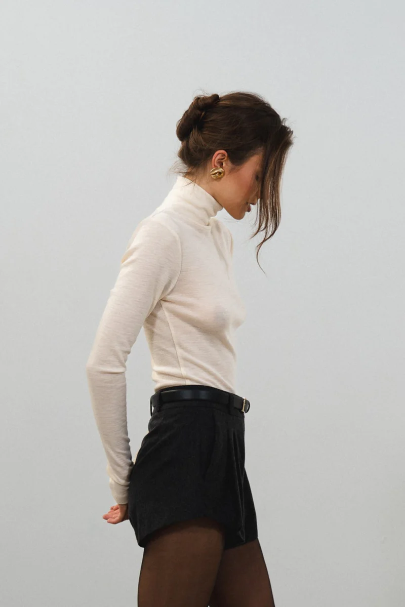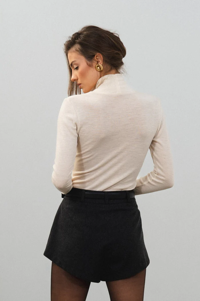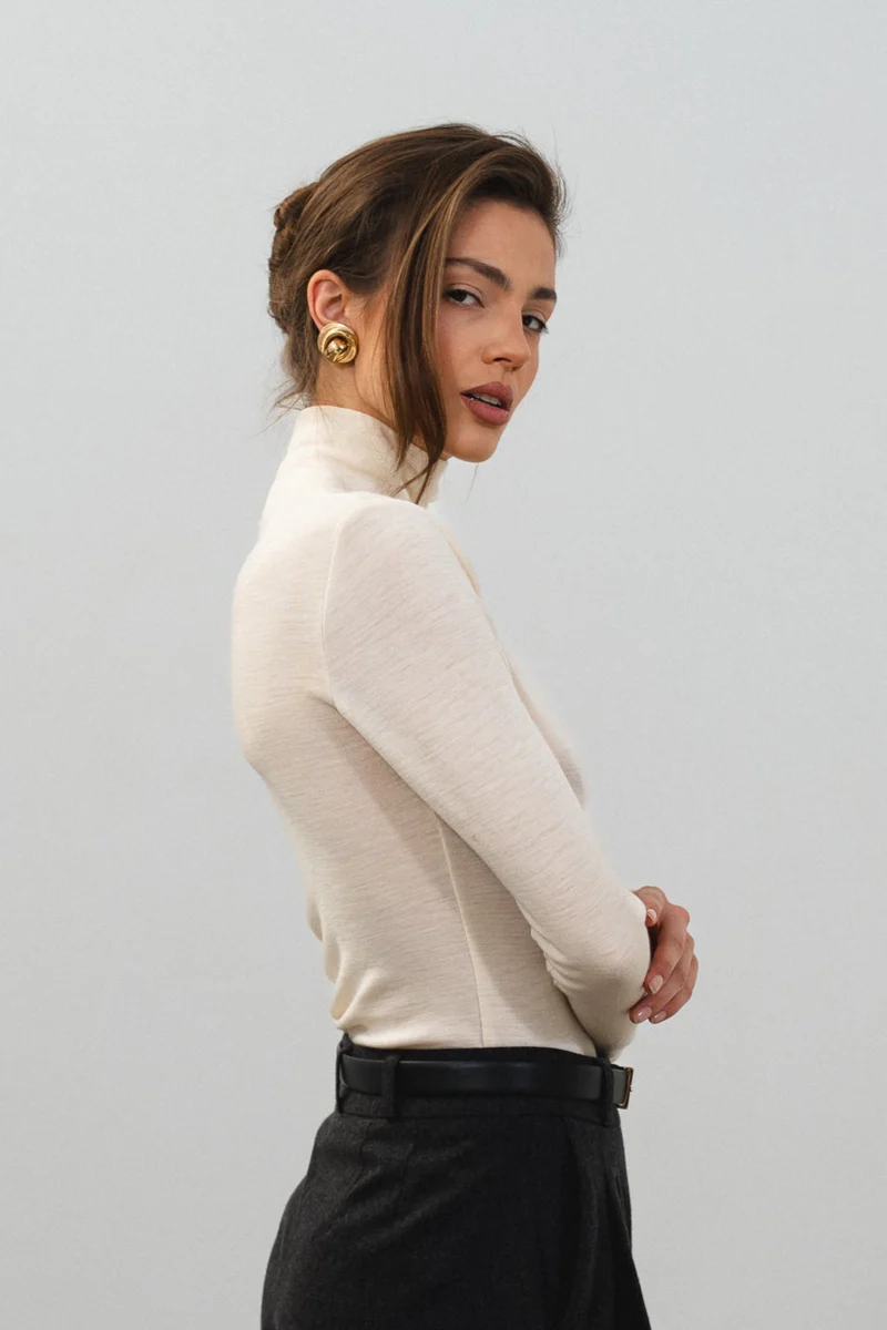 Subtelna reinterpretacja klasyki lat 90. Golf w odcieniu kremu łączy minimalizm z elegancją – rozświetla stylizację, zachowując ponadczasowy charakter.