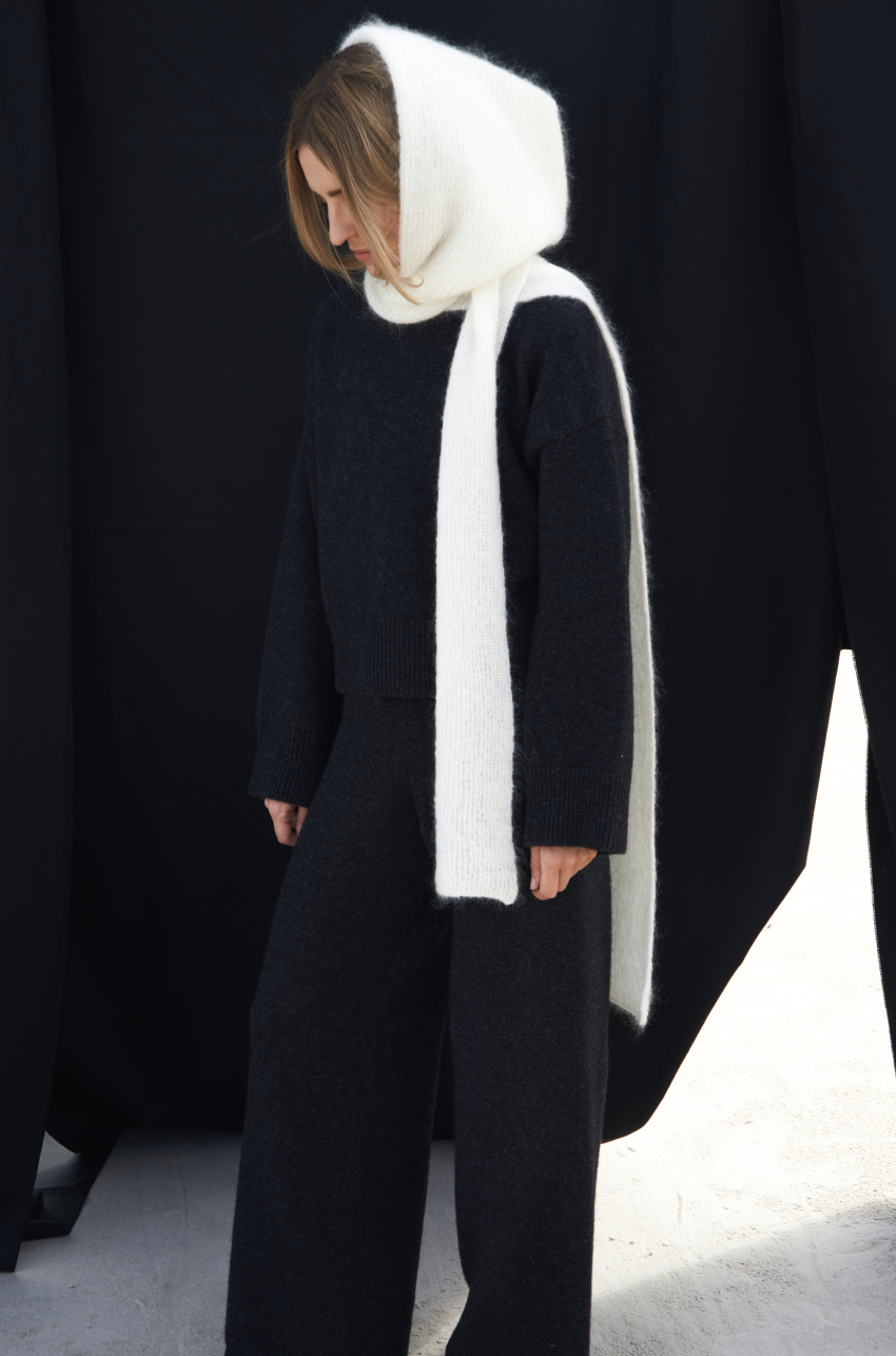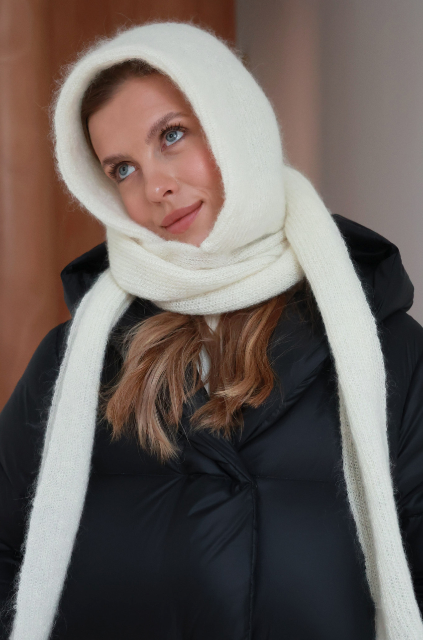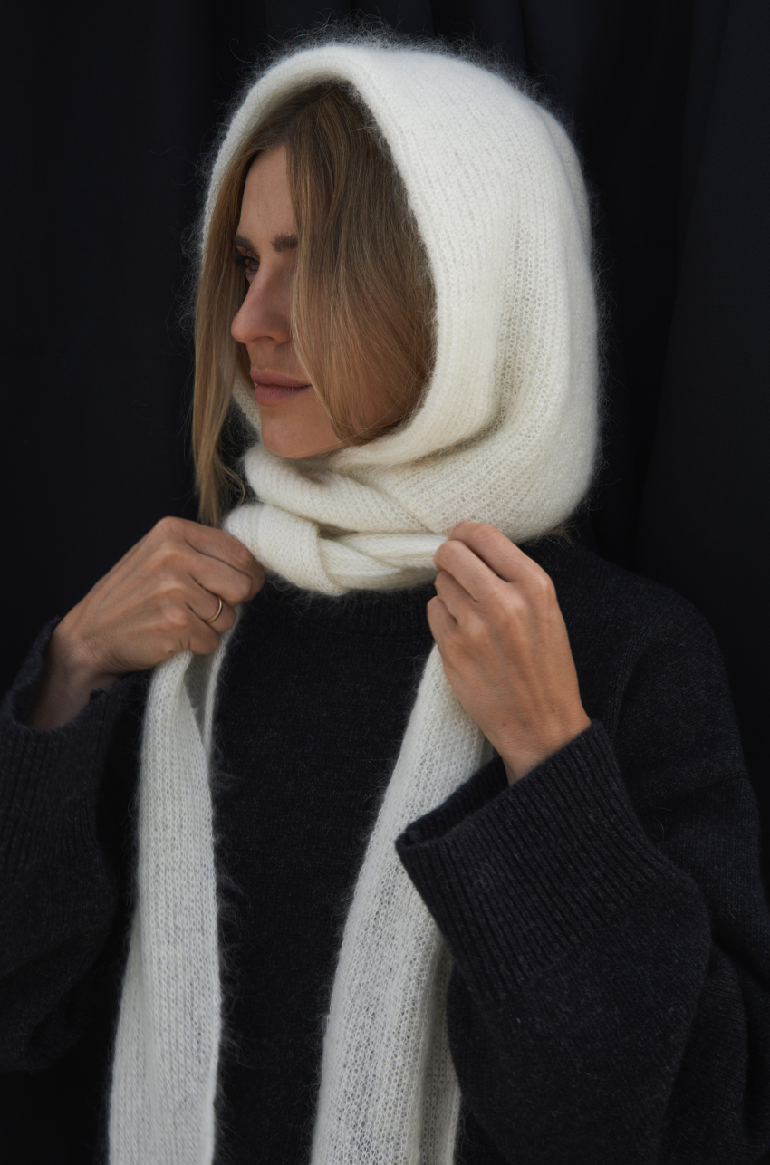 Dzianinowy kaptur z wiązaniem, wykonany w 65% z przędzy super kid mohair. Możesz nosić go na wiele sposobów. Miękki i puszysty, ponieważ przędza super kid mohair ma widoczny lśniący włos, który sprawia, że wykonane z niej dodatki i ubrania pięknie odbijają światło.