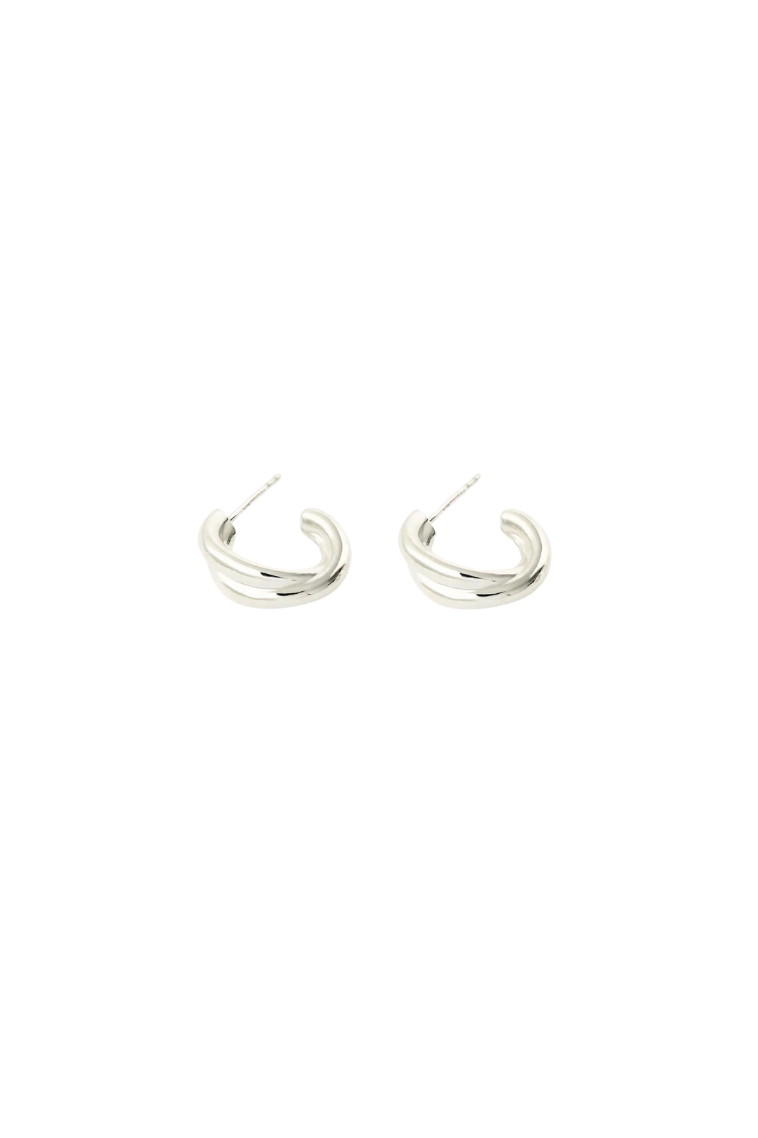 Monolityczne kolczyki wykonane ze srebra próby 925, złożone z trzech przeplatających się okręgów. Gładkie powierzchnie równoważą ich masywną formę, tworząc harmonijną i wyrazistą kompozycję. Całkowita długość kolczyka to 18 mm.