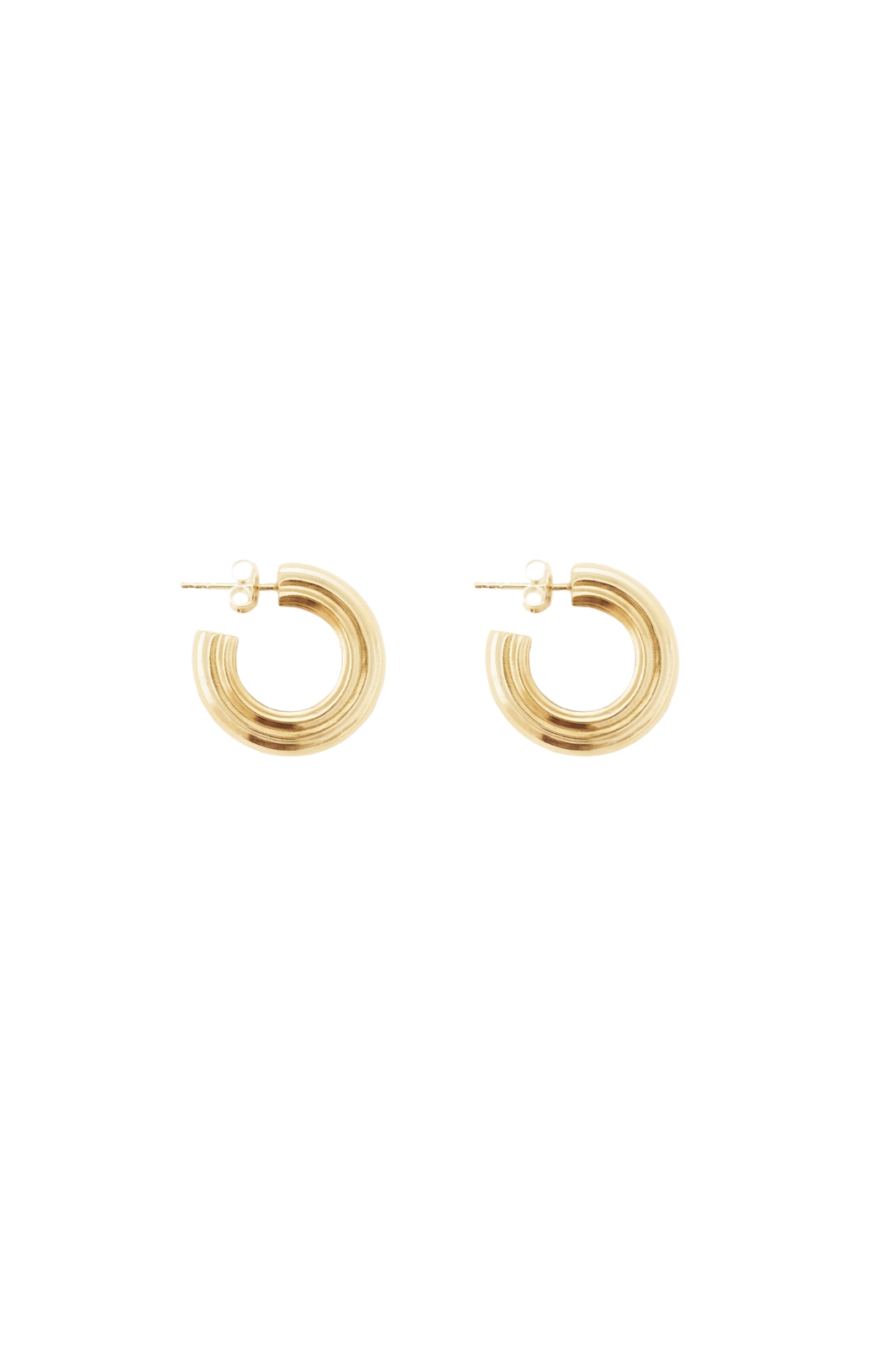 Efektowne, kolczyki na sztyfcie o wyrazistej formie koła z subtelnymi rowkami. Inspirowane linią wybrzeża i rytmem morskich fal, wykonane z pozłacanego 18k złotem srebra próby 925. średnica zewnętrzna kolczyka to 2 cm.