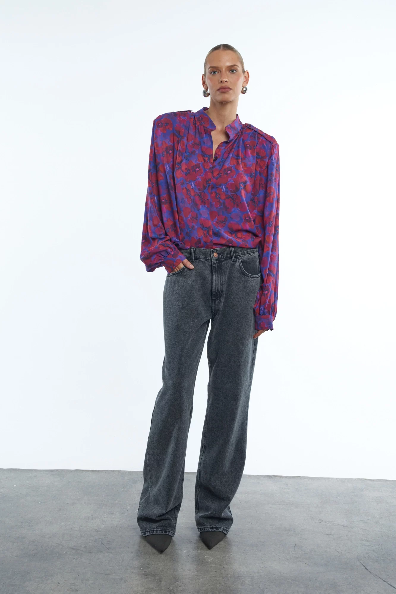 Koszula ze stójką o prostym, pudełkowym fasonie, która łączy w sobie kobiecość i wyrazisty charakter. Uszyta z miękkiej wiskozowej tkaniny o intensywnym, kwiatowym princie. Jej klasyczny krój przełamują mocne ramiona z wszytymi poduszkami, marszczeniem i pagonami. Ma szerokie, bufiaste rękawy zakończone wąskim mankietem, które nadają koszuli lekkości. To propozycja idealna zarówno na co dzień, jak i na wyjątkowe okazje – zestawiona z jeansami doda szyku, a w połączeniu z eleganckimi spodniami czy spódnicą stworzy stylizację pełną klasy.
