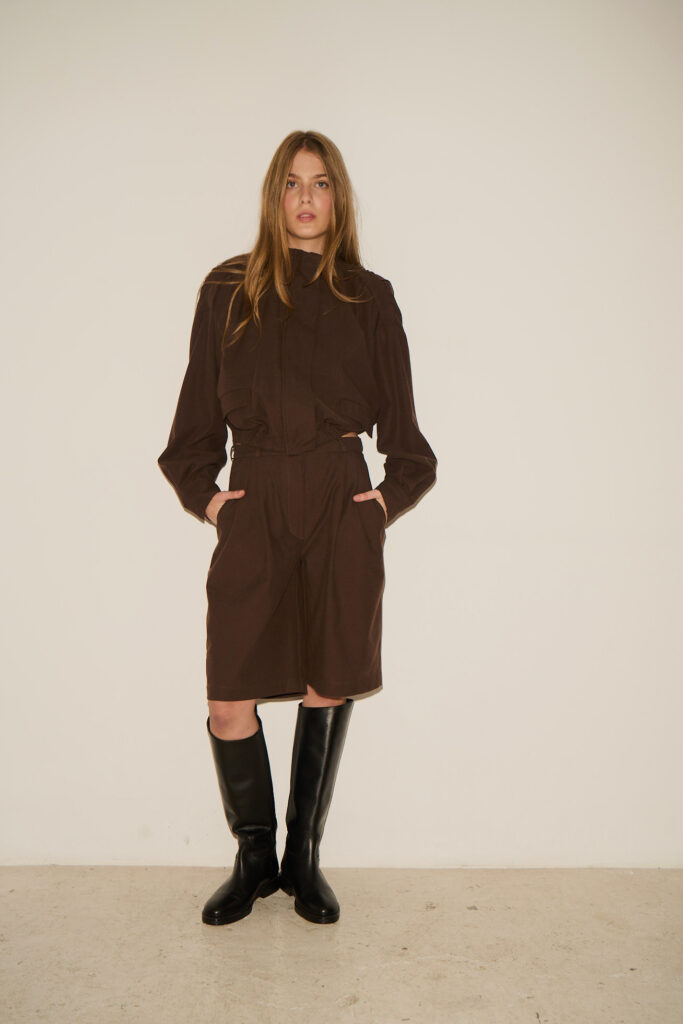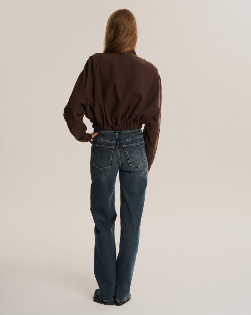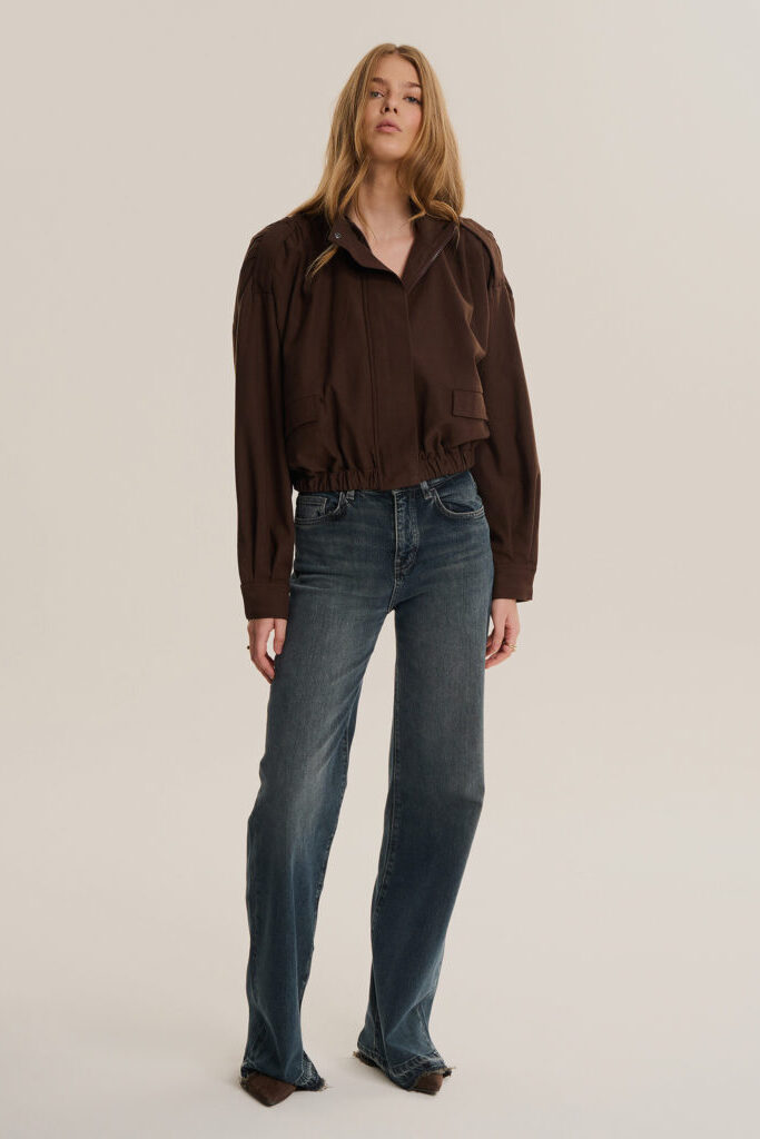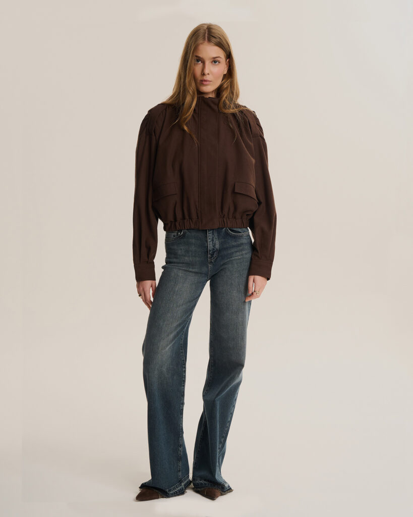 Krótka kurtka z wysokim kołnierzem w stylu lat 80. Kieszenie z przodu, zapięcie na suwak oraz dodatkowo na napy. Na ramionach marszczenie podkreślone delikatnymi poduszkami. U dołu wykończenie gumą. Wykonana z grubiej tkaniny w kolorze brązowym. Stwórz total look z bermudami Bea.