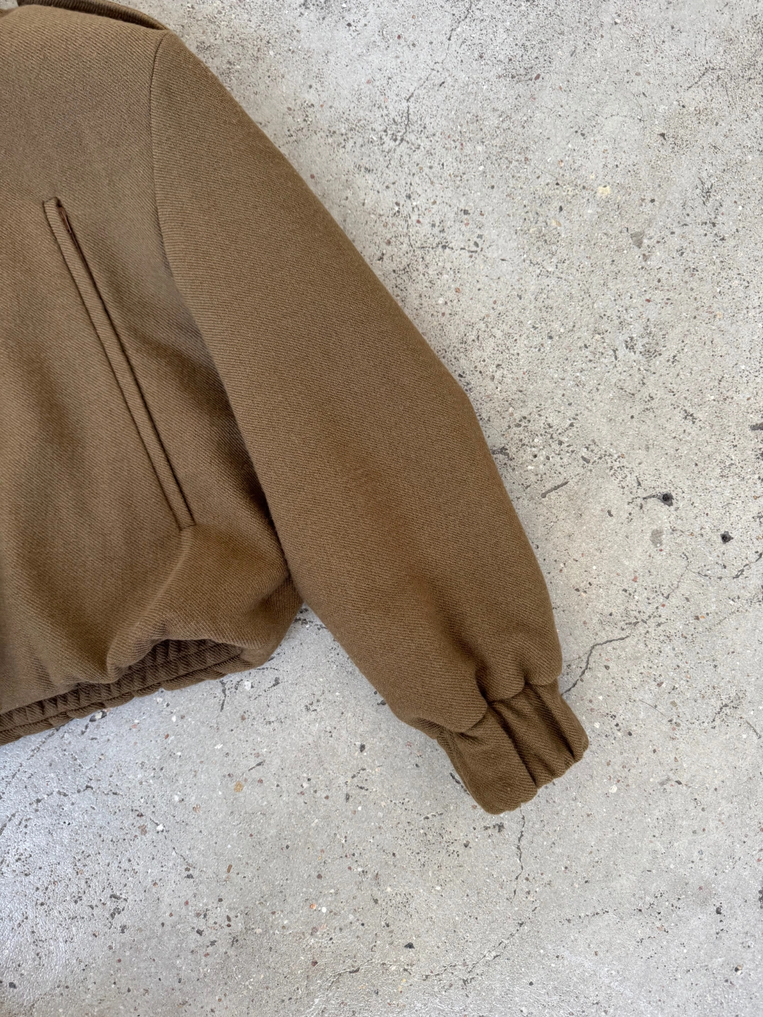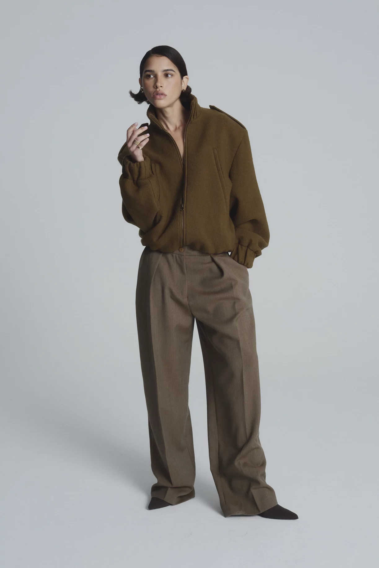 Kurtka wykonana z miękkiej wełny o subtelnym, diagonalnym splocie. Krótszy fason z dużą stójką, szerokimi rękawami ze ściągaczem i wyraźnie podkreśloną talią tworzy nowoczesną, wyważoną sylwetkę. To połączenie sportowego luzu, elegancji i militarnego charakteru, w którym komfort spotyka się ze stylem.