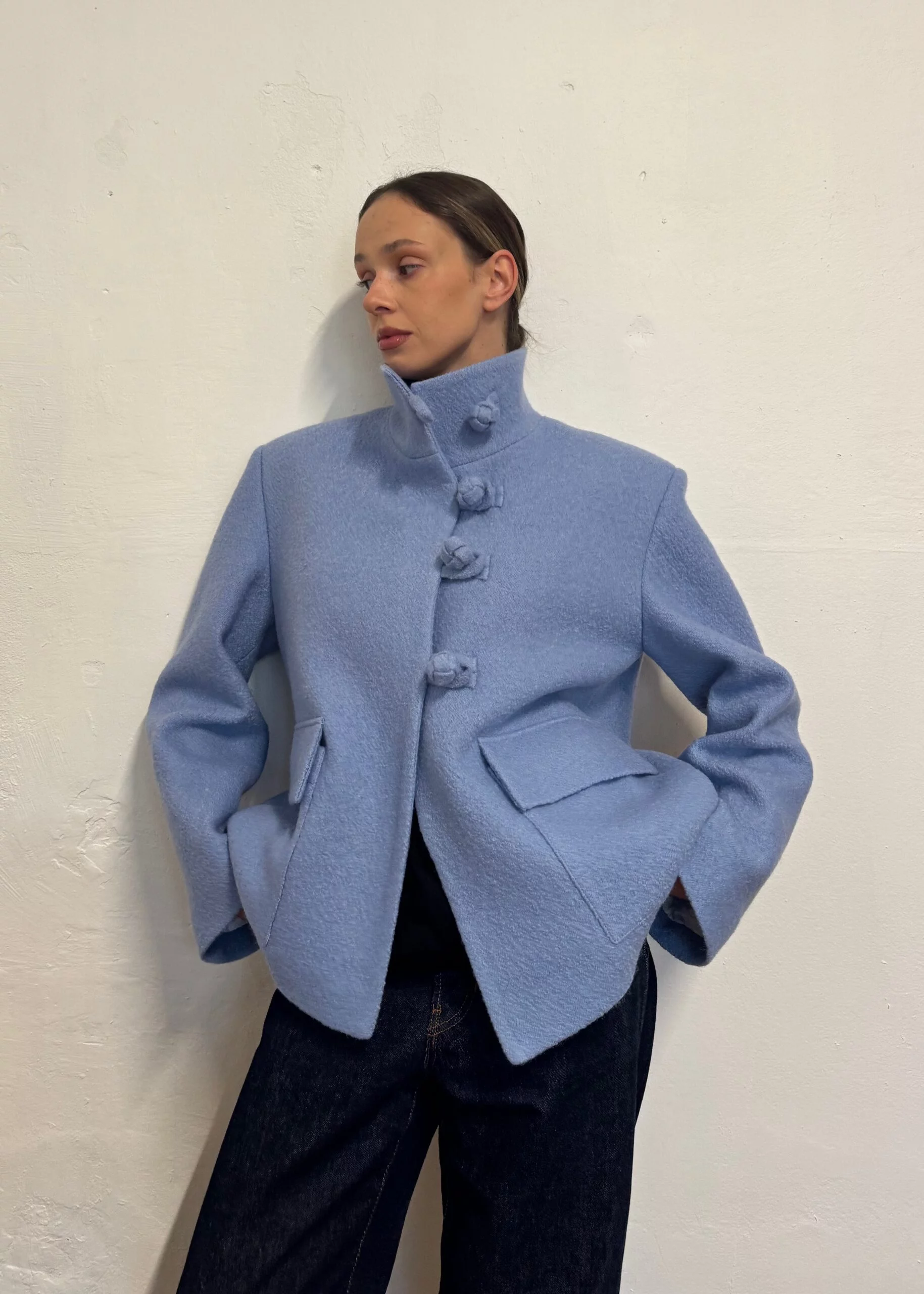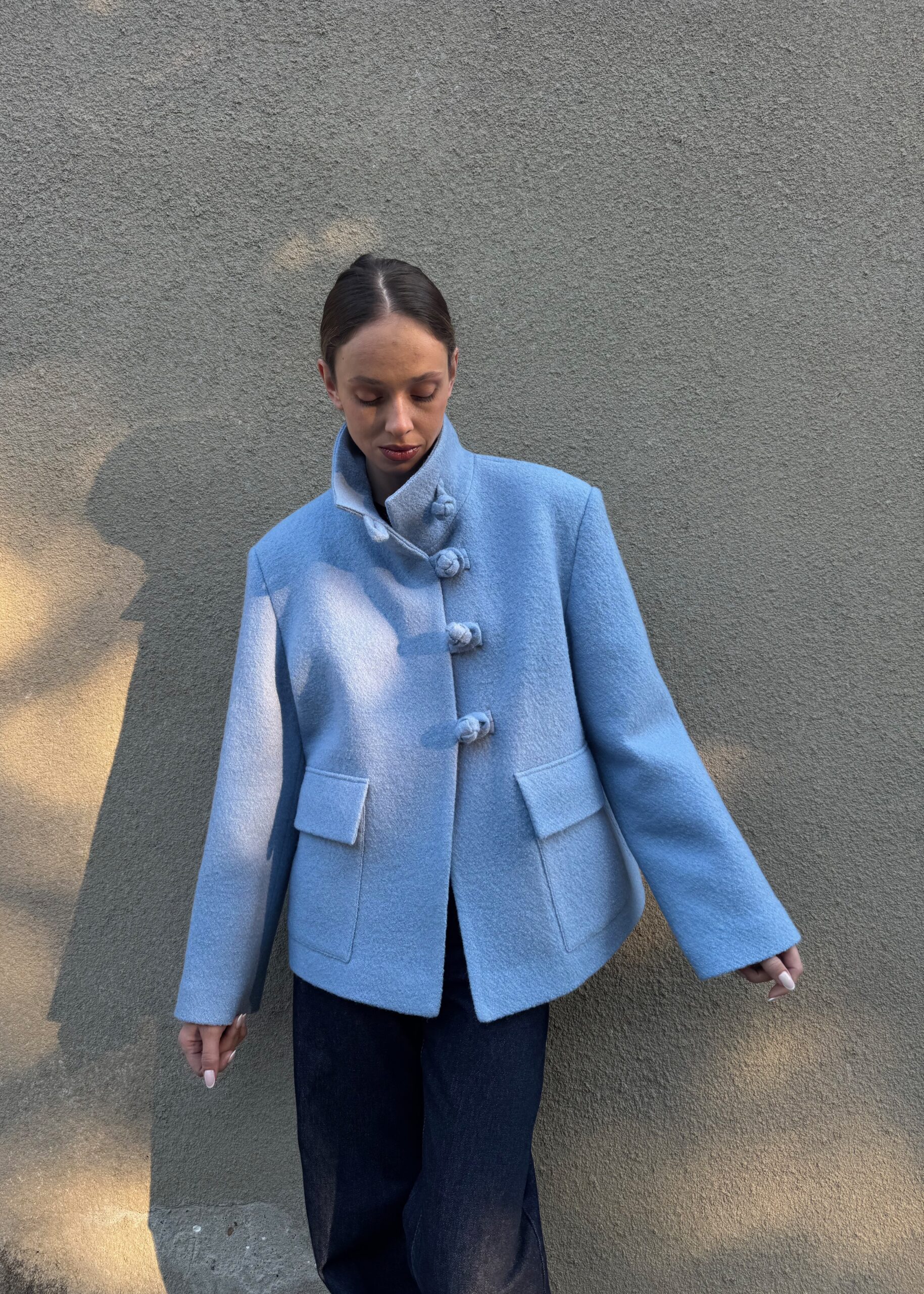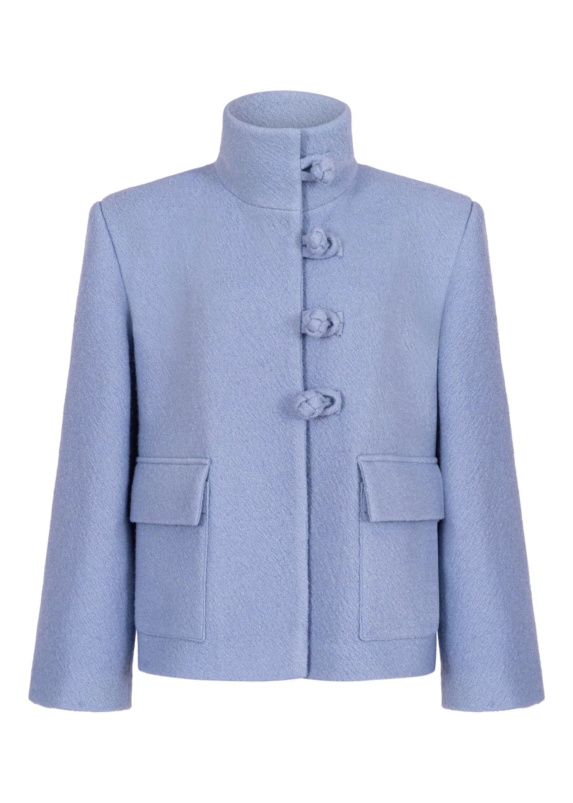 Wełniana kurtka o pudełkowym kroju, zapinana na unikatowe, ozdobne zapięcia.
