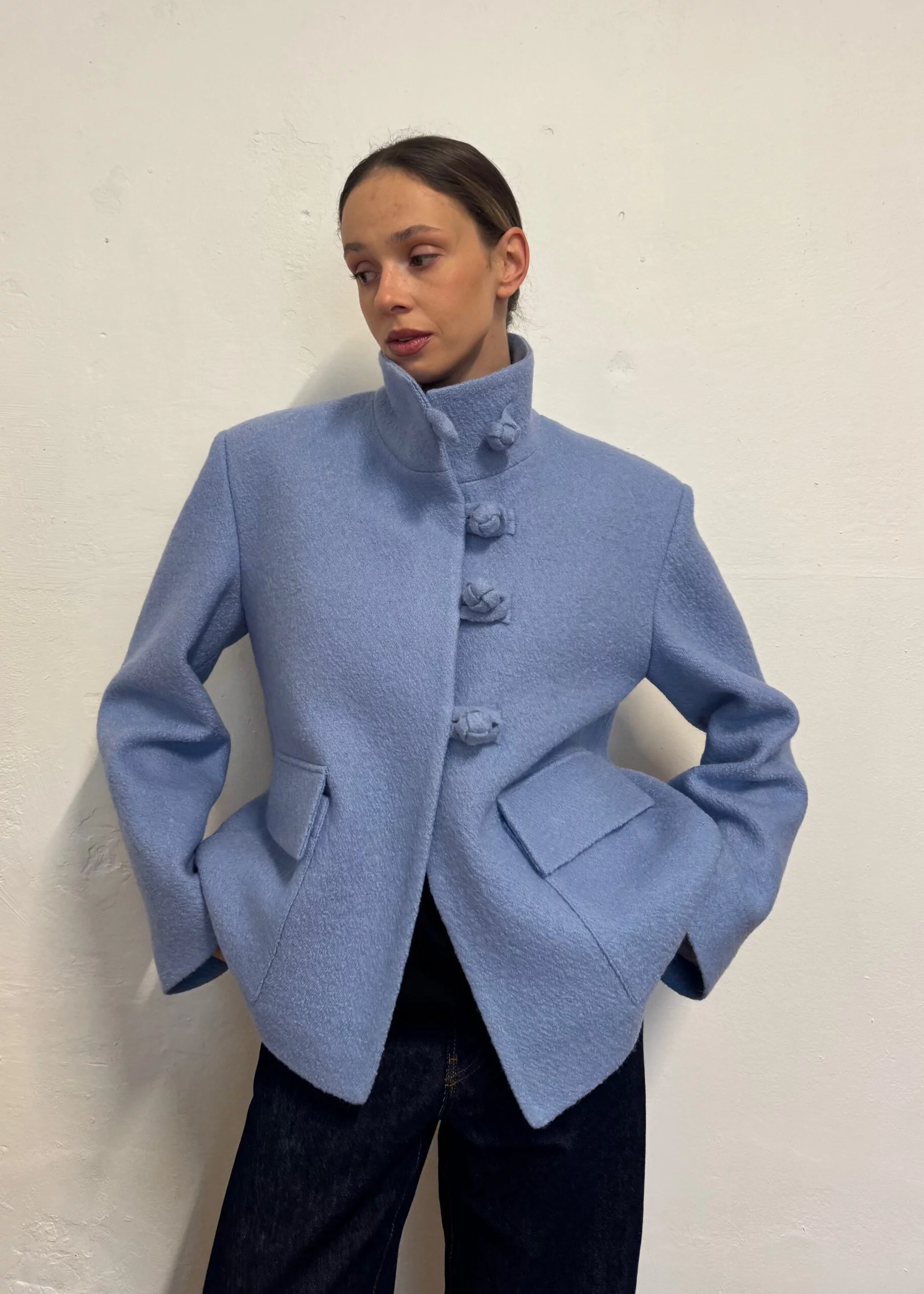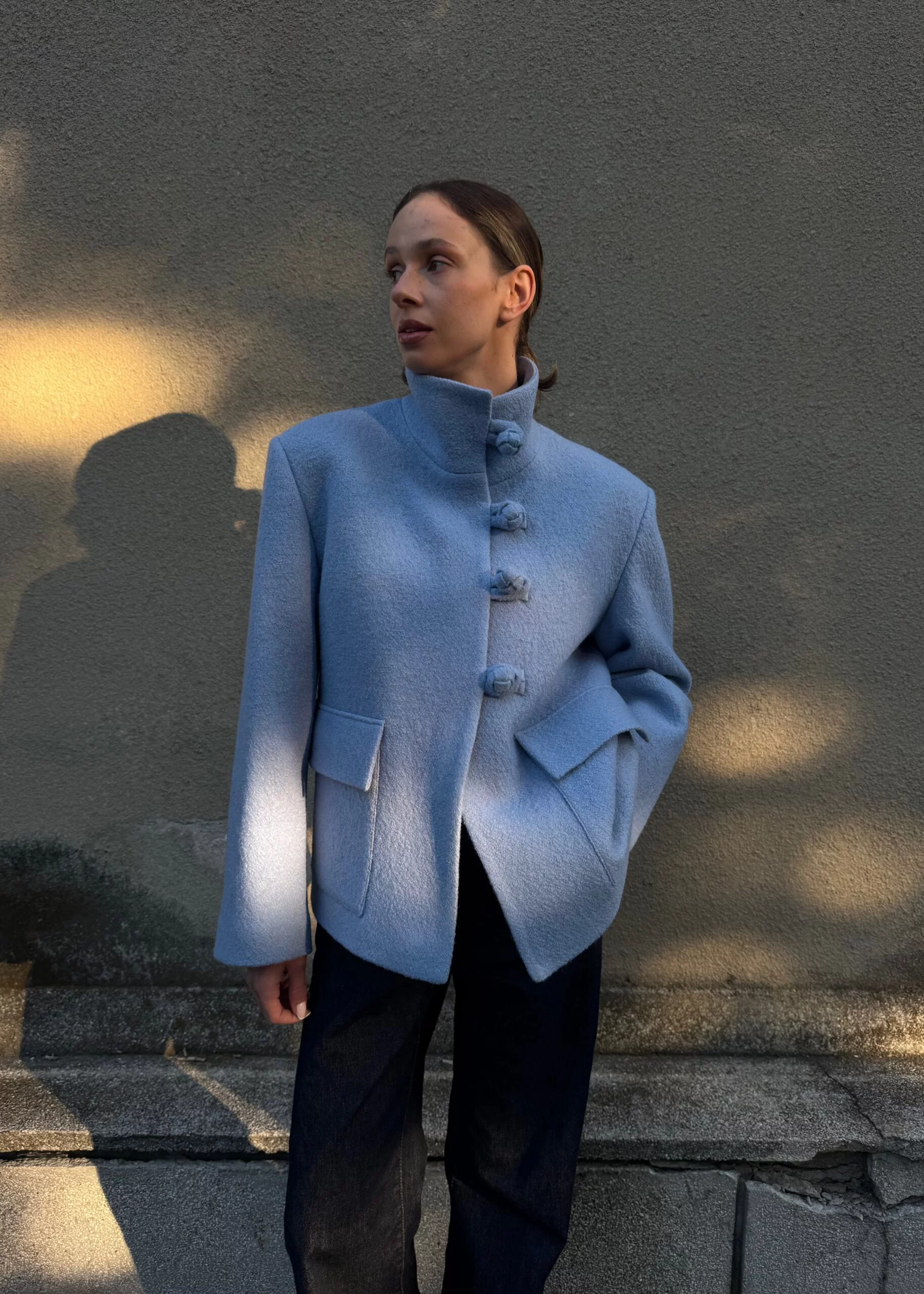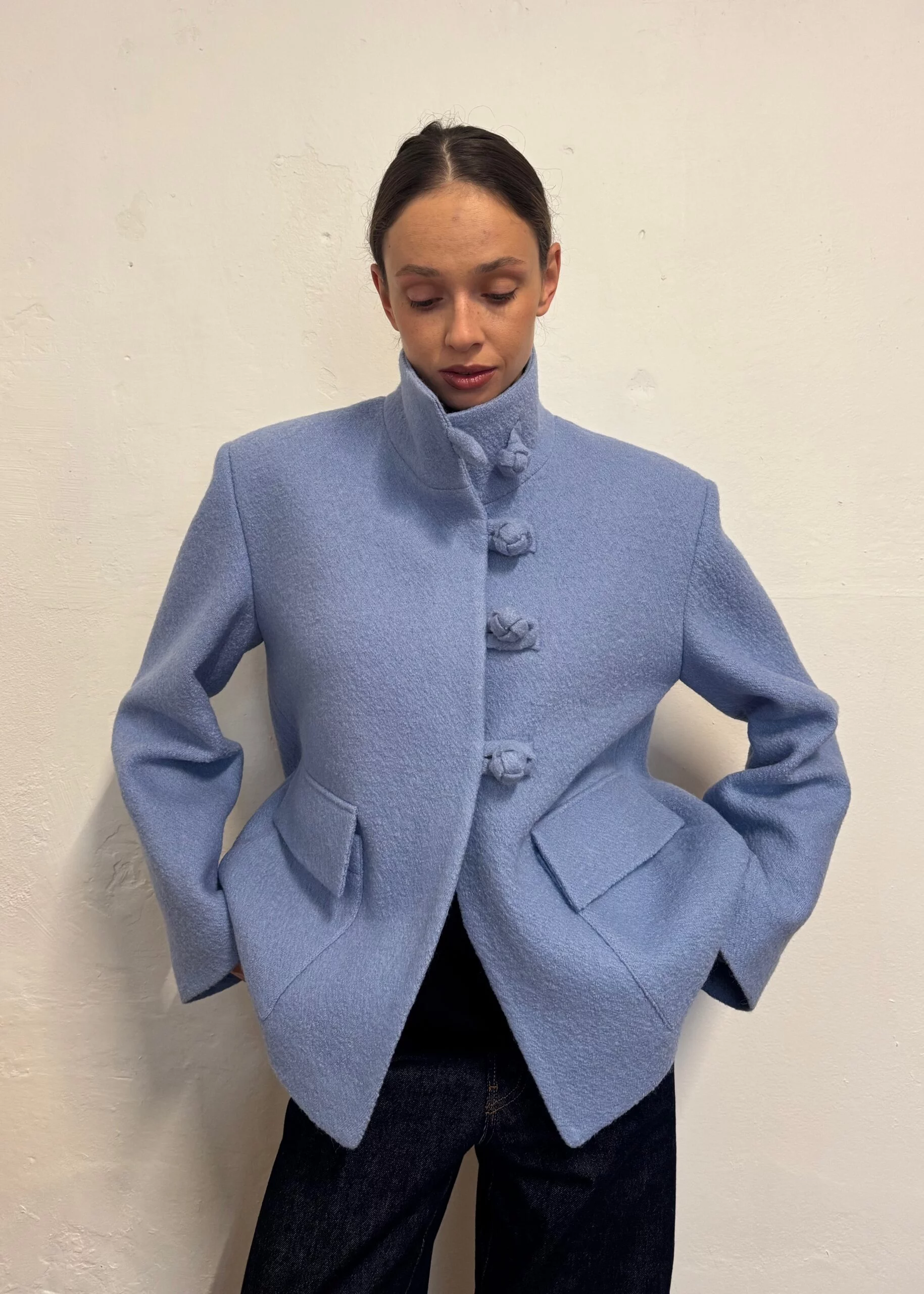 Wełniana kurtka o pudełkowym kroju, zapinana na unikatowe, ozdobne zapięcia.