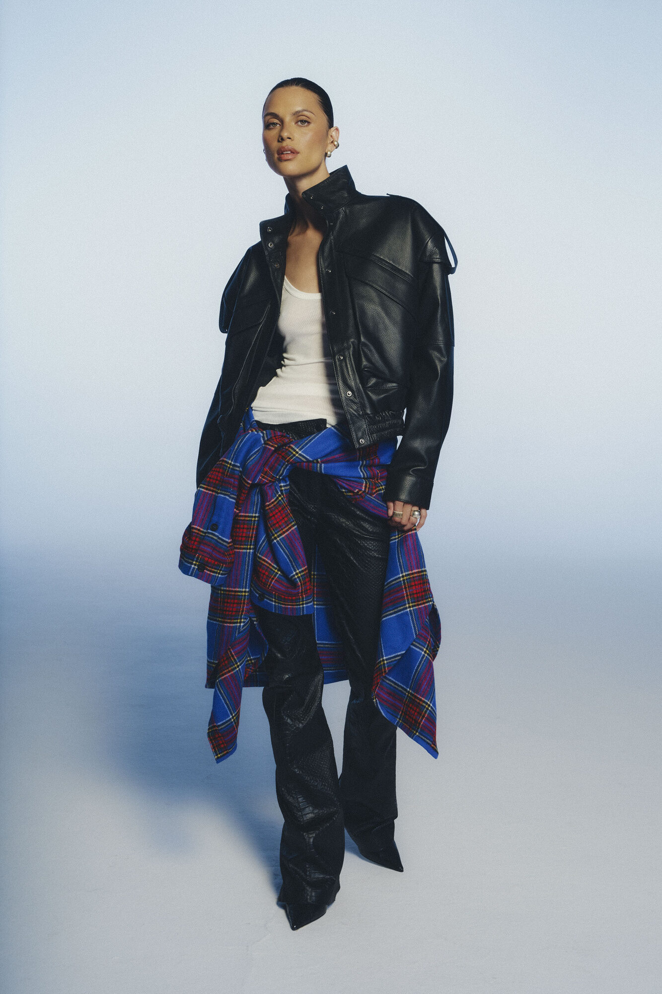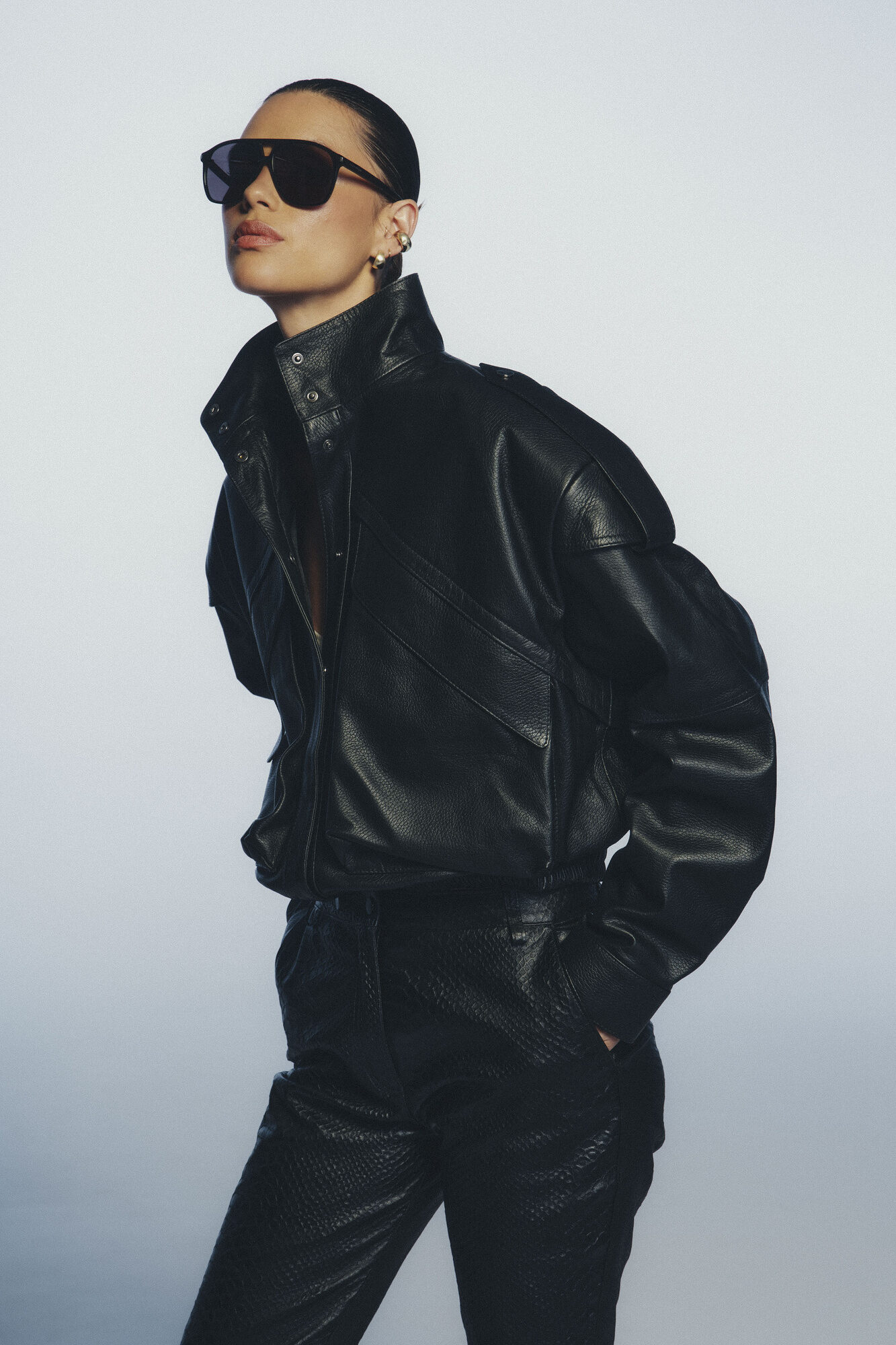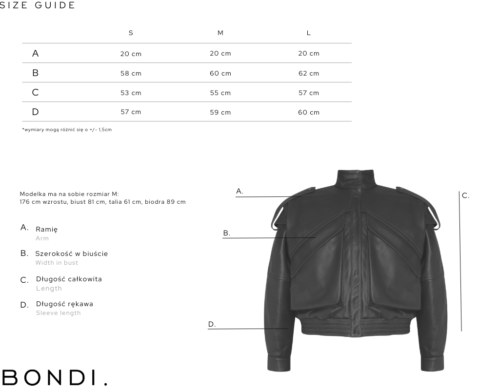 Krótka kurtka wykonana w 100% ze skóry jagnięcej w klasycznej czerni. Utrzymana w fasonie pilotki – ma wąski ściągacz w pasie, wysoką stójkę i unikalne detale – pagony na ramionach, duże kieszenie na przodzie, ozdobne szwy i charakterystyczną fakturę. Zapinana na zatrzask. Jest połączeniem stylowej nonszalancji i sportowego luzu, dlatego noś ją jak chcesz – w wersji codziennej z jeansami lub eleganckiej z garniturowymi spodniami i koszulą. To ponadczasowa propozycja, która przy odpowiedniej pielęgnacji będzie Ci służyć bardzo długo.