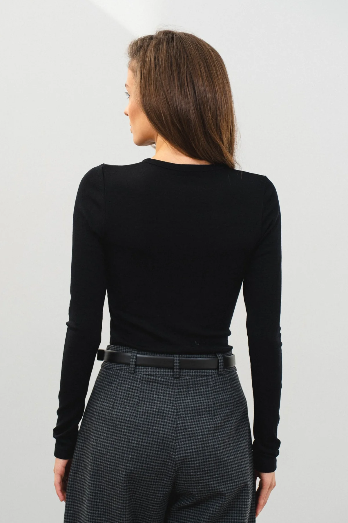 Minimalistyczny longsleeve w kolorze czerni to ukłon w stronę lat 90., kiedy prostota i funkcjonalność wyznaczały kierunek mody. Smukły krój z długim rękawem podkreśla sylwetkę, pozostając jednocześnie wygodną bazą do wielu stylizacji.