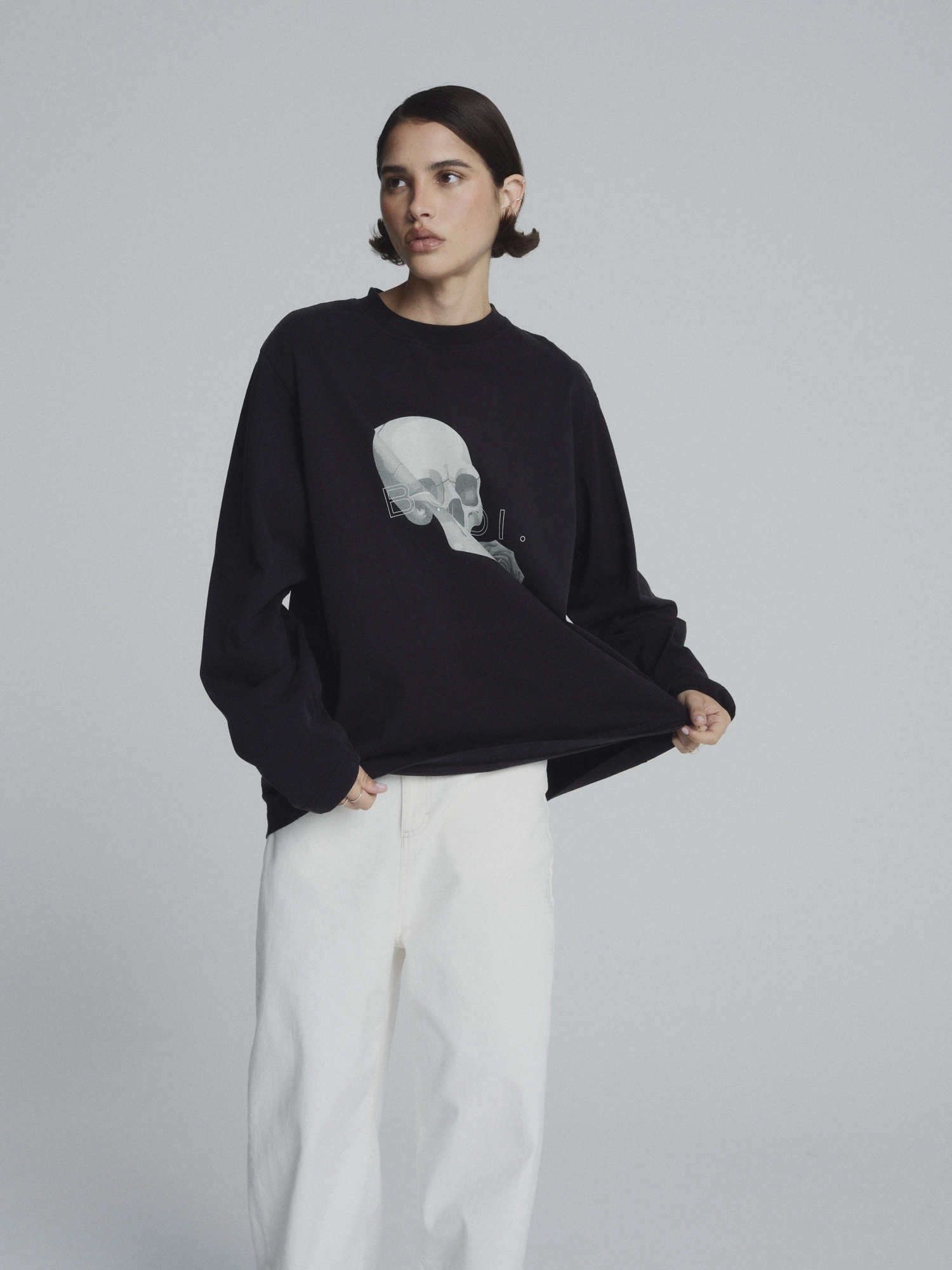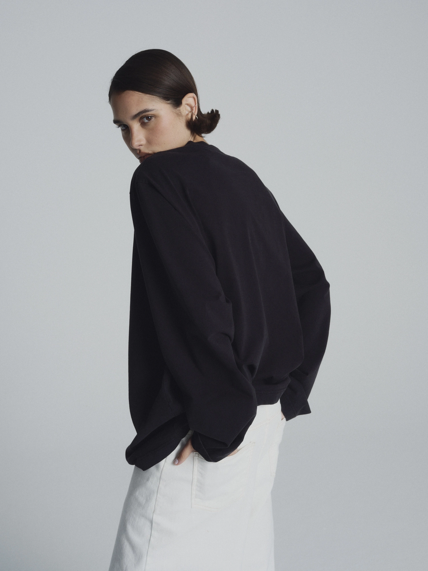 Longsleeve oversize uszyty w 100% z mięsistej, wysokogatunkowej bawełny o subtelnym efekcie sprania. Miękki, przyjemny w dotyku i wyjątkowo komfortowy w noszeniu. Luźny, lekko wydłużony krój nadaje mu nowoczesny, swobodny charakter i sprawia, że doskonale układa się na sylwetce.