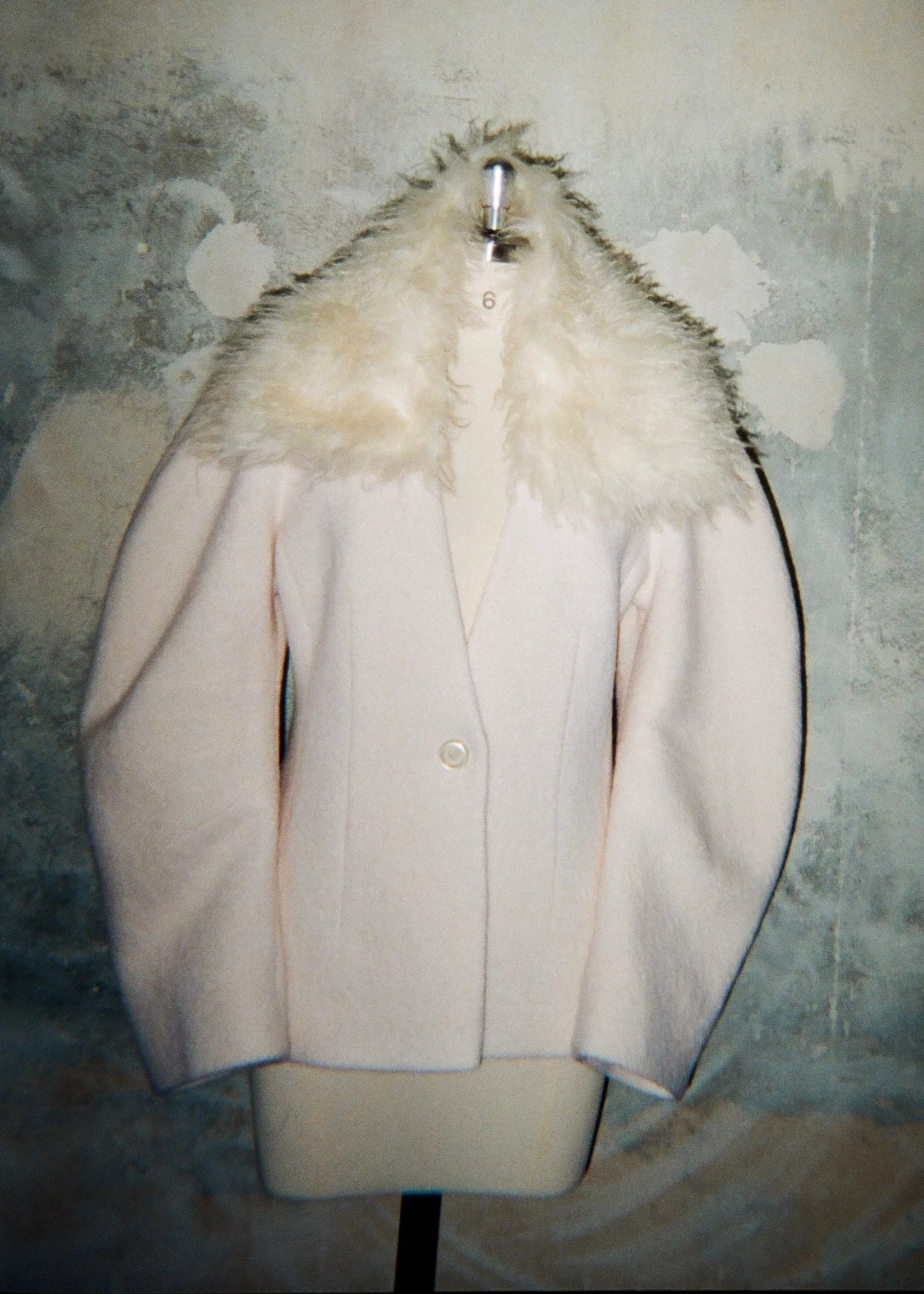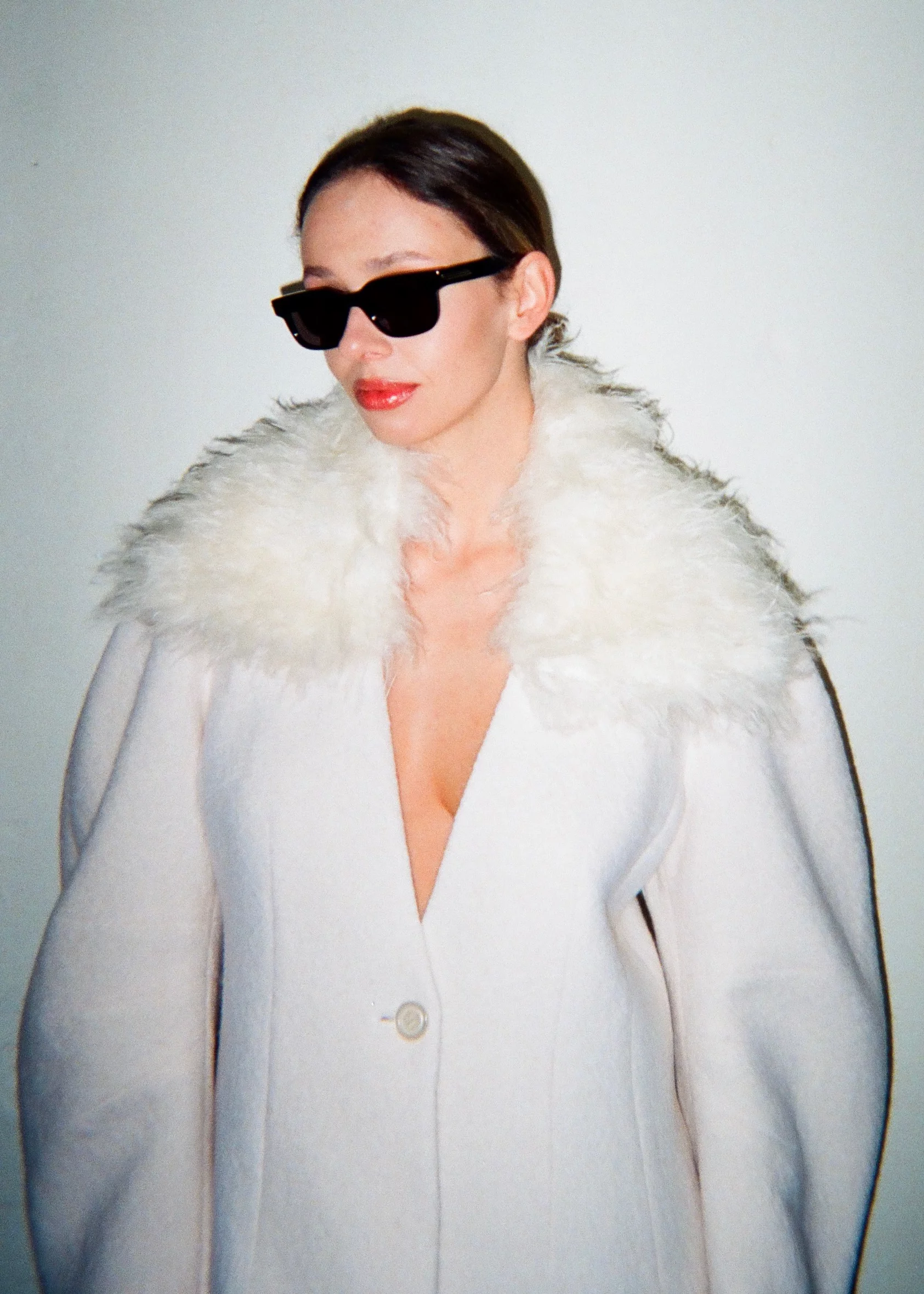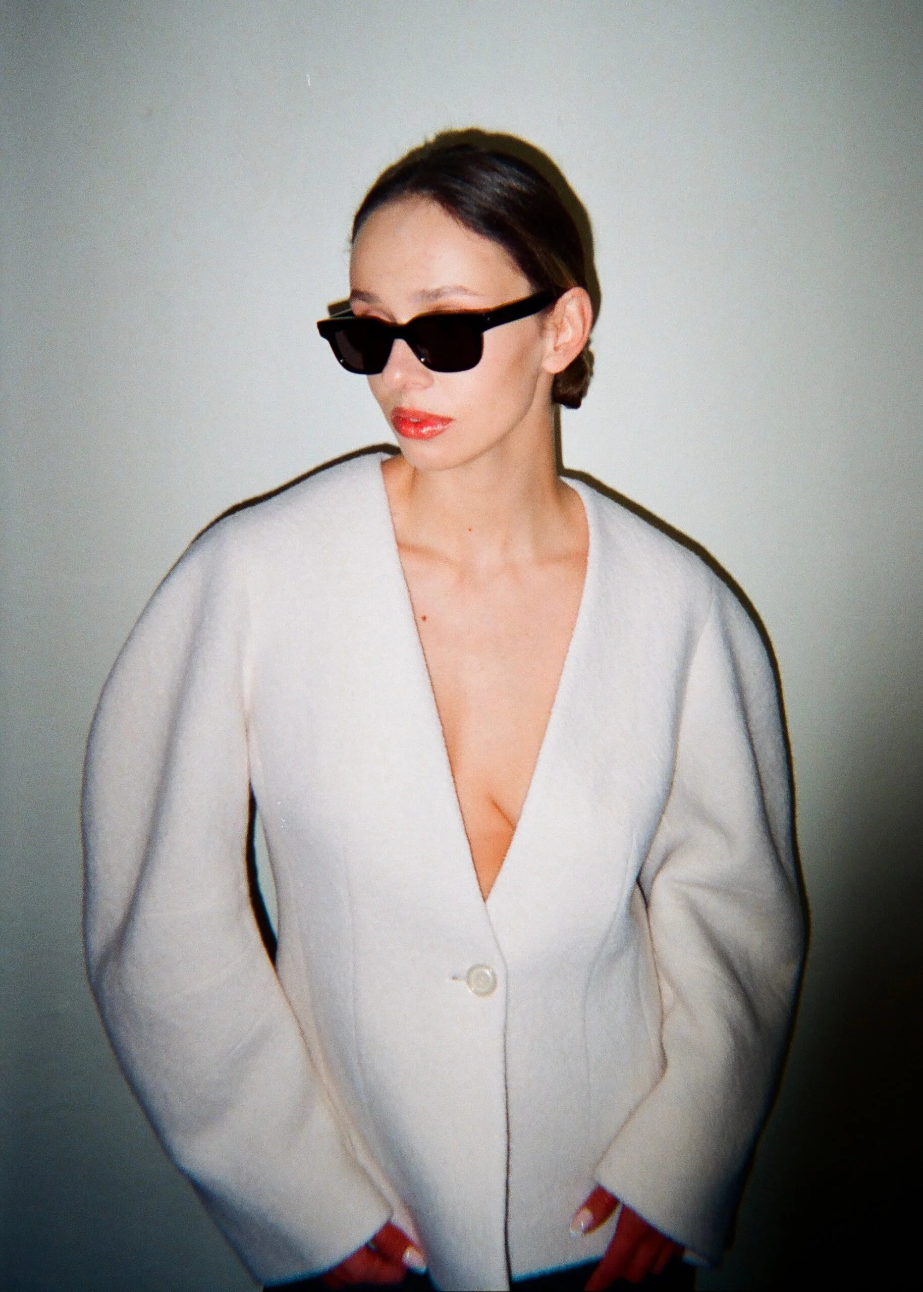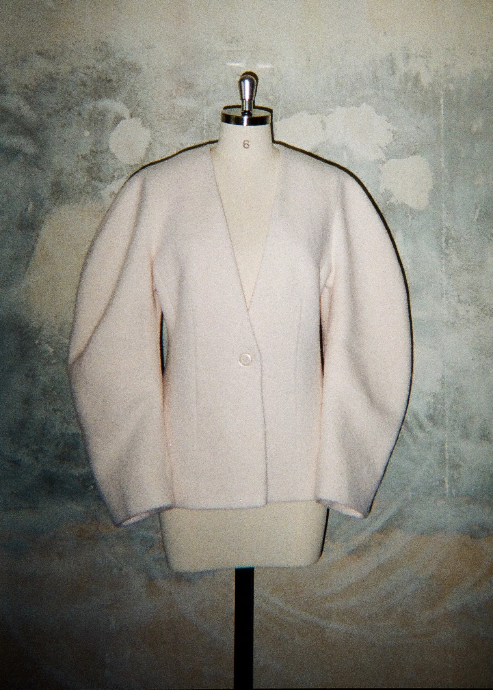 Taliowana marynarka uszyta z miękkiej wełny w kolorze eleganckiej śmietanki. Inspirowana koszulą Yanina, zyskała subtelny dekolt w serek oraz charakterystyczne, lekko zaokrąglone rękawy.