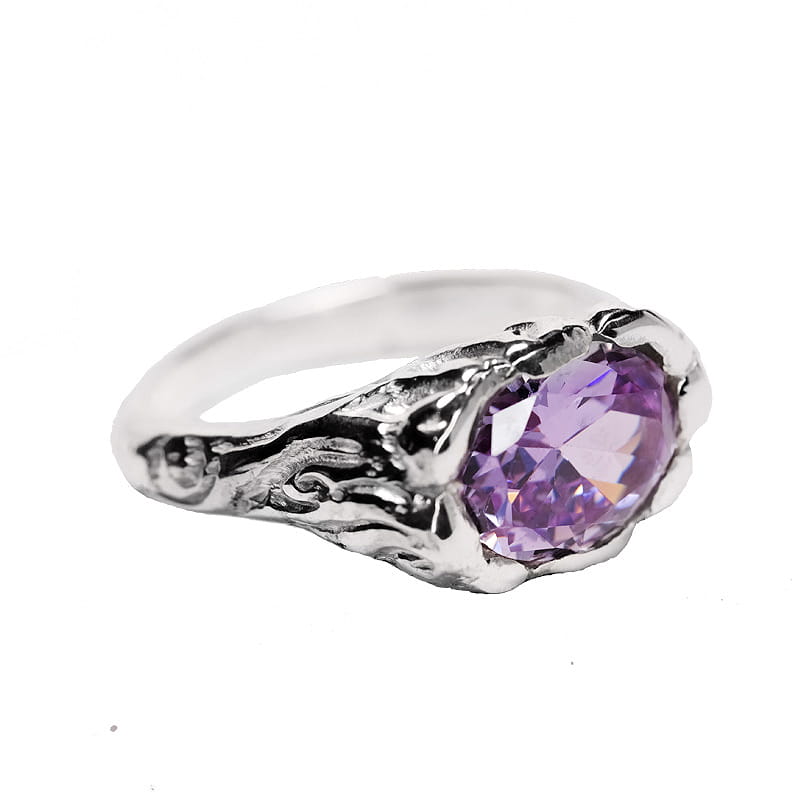 Kamień: zdobi go obszerna jasnofioletowa cyrkonia