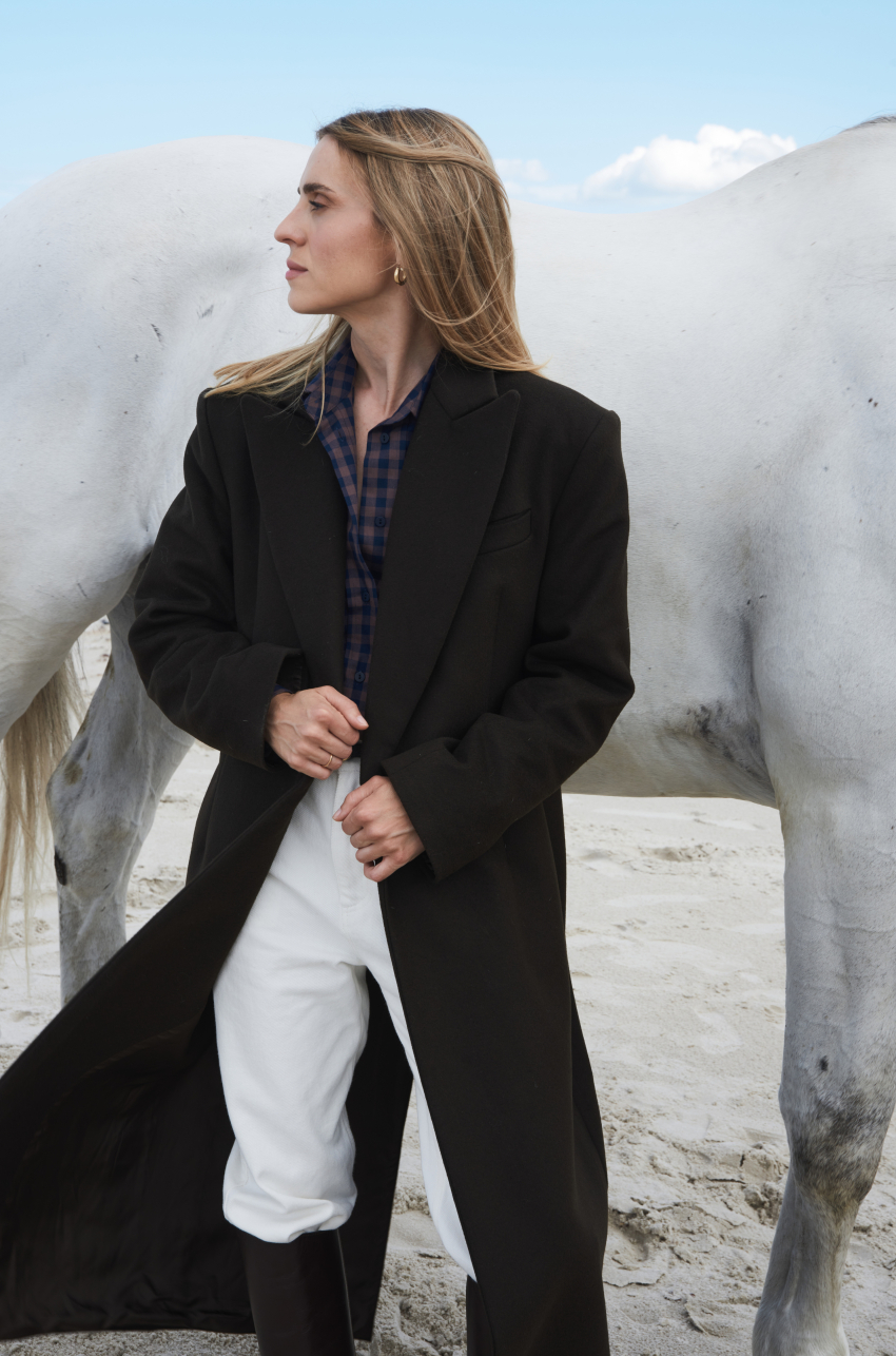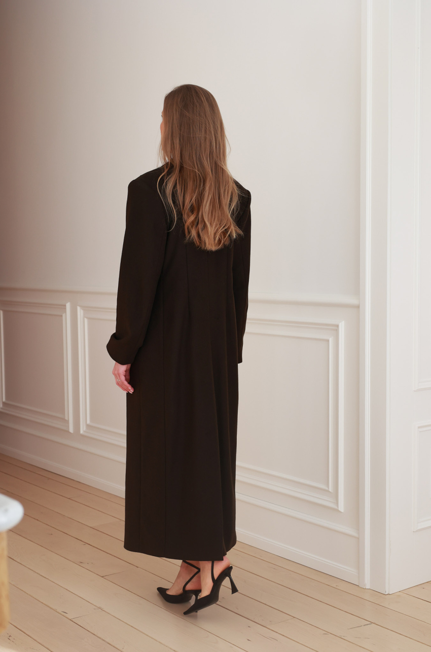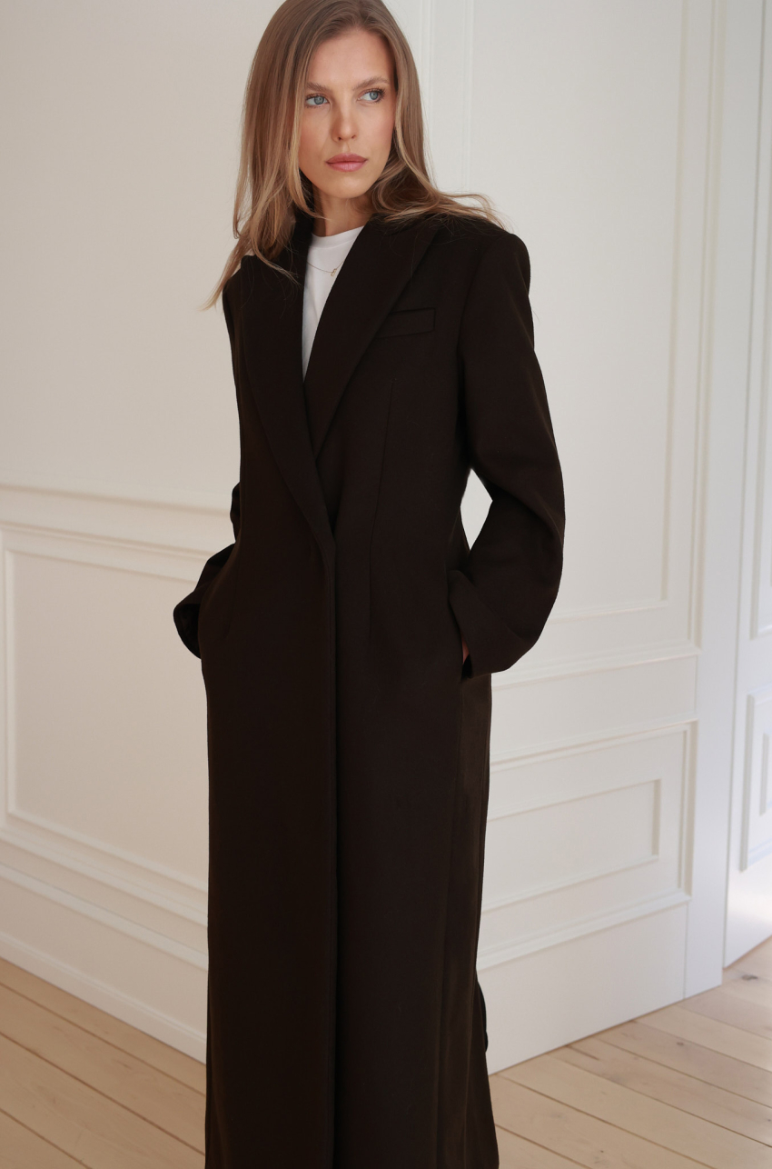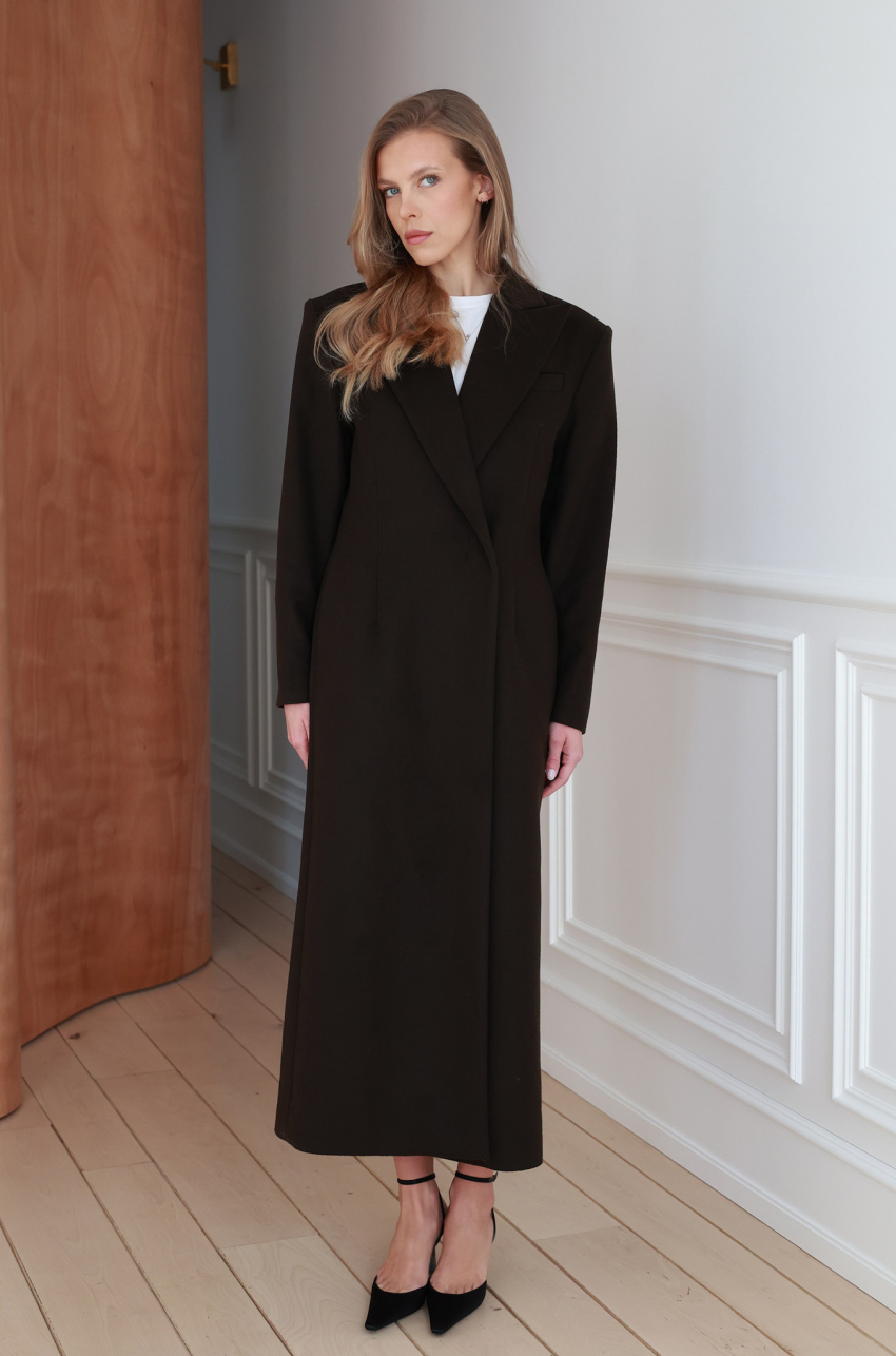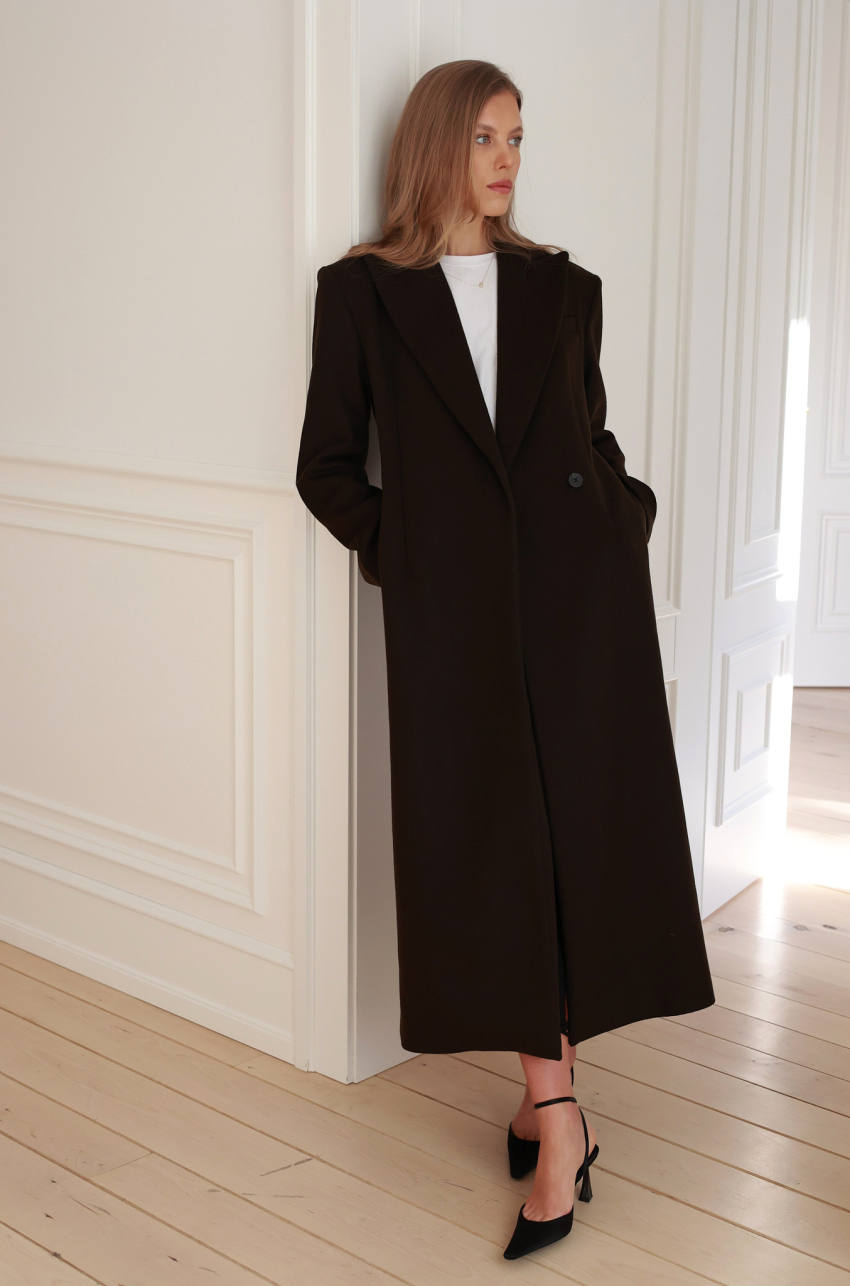 Długi płaszcz w eleganckim odcieniu brązu, wykonany z wełnianej tkaniny o bardzo grubej gramaturze. Minimalistyczna forma z zaakcentowanymi ramionami oraz smukłymi, wydłużającymi sylwetkę liniami. Płaszcz zapinany jest na guziki ukryte pod listwą, co podkreśla jego czystą, architektoniczną formę. Klasyczne klapy, kieszenie po bokach i starannie dopracowana długość nadają mu wyjątkowo eleganckiego charakteru.