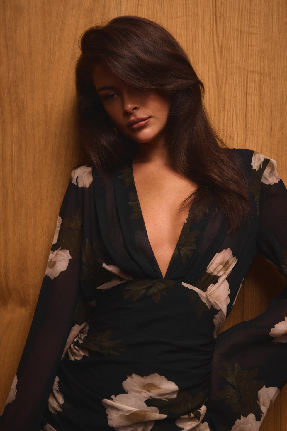 Czarna tkanina zdobiona romantycznym, kwiatowym wzorem nadaje kreacji wyjątkowego charakteru – łącząc elegancję z lekkością. Głęboki dekolt w kształcie litery V dodaje zmysłowości, a zwiewne rękawy z delikatnego materiału tworzą efekt lekkości i ruchu.