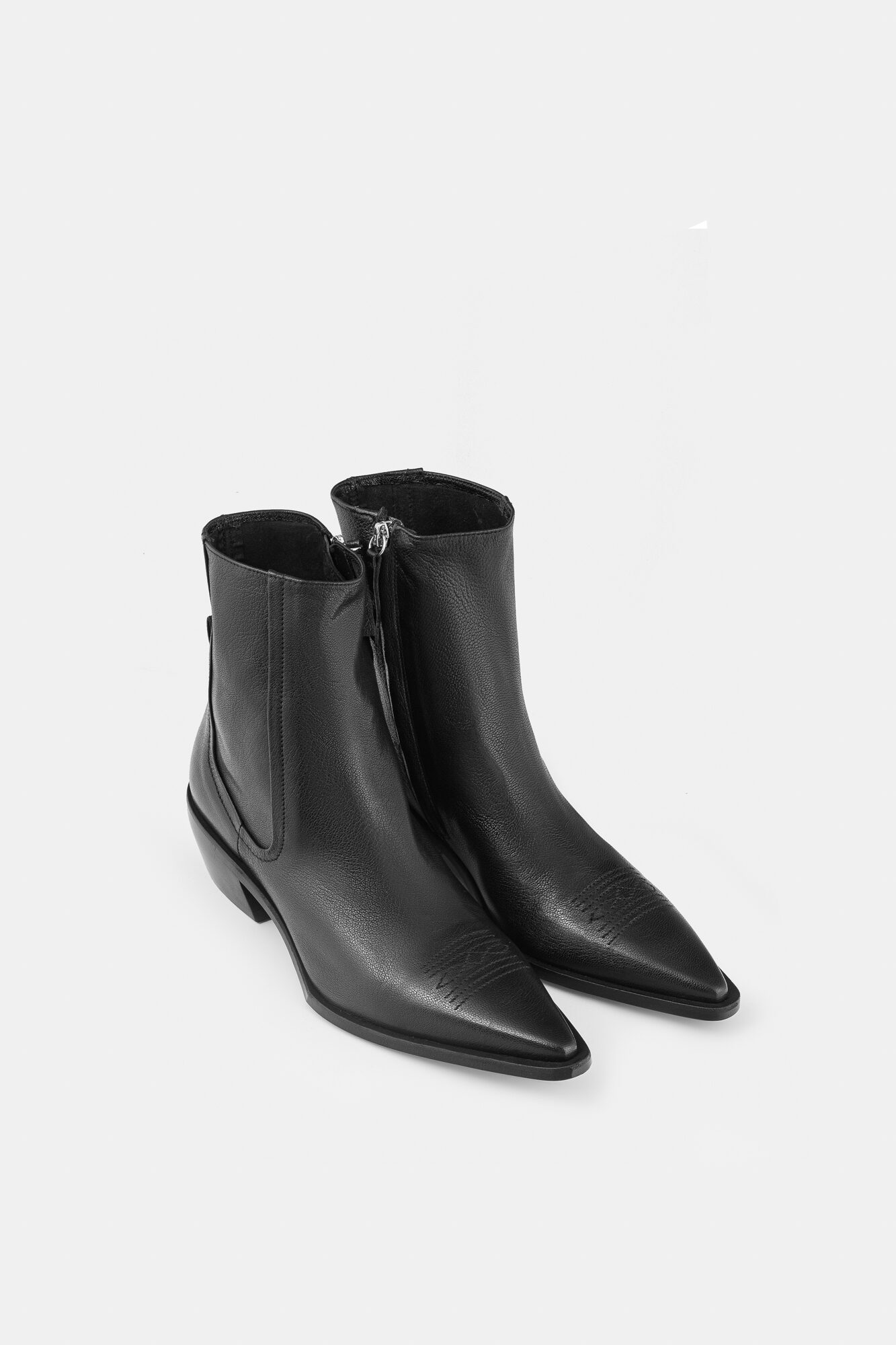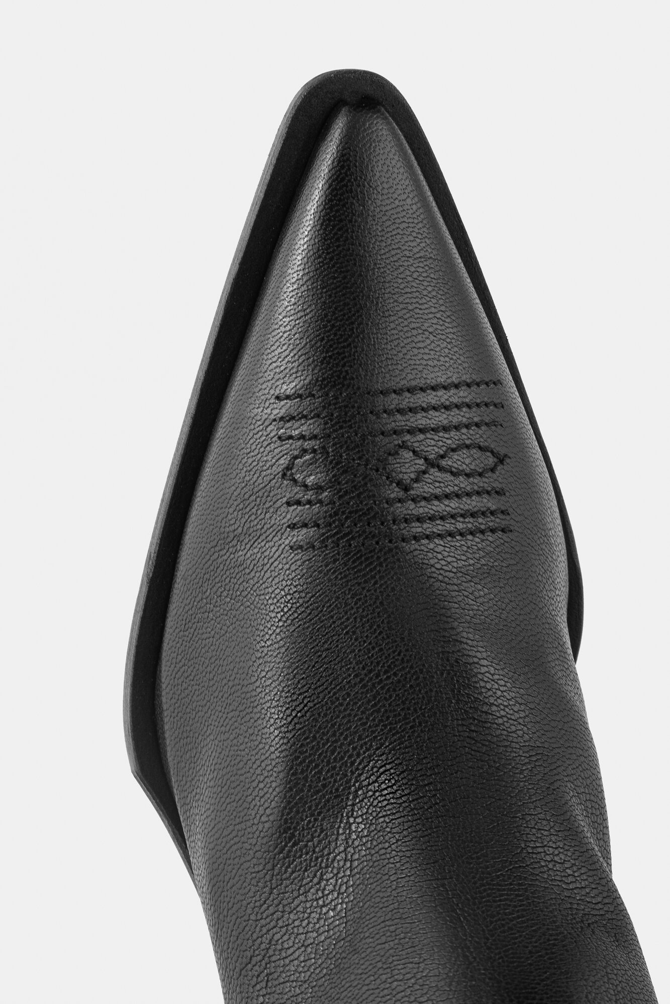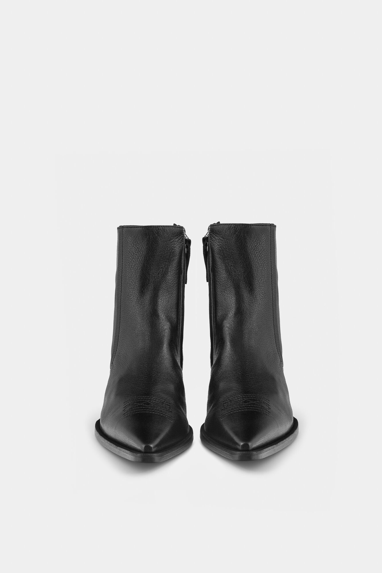 Niezwykle miękkie kowbojki za kostkę wykonane z czarnej skóry licowej o wąskiej cholewce. W modelu tym nie zastosowaliśmy podszewki, dzięki czemu kowbojki są bardzo miękkie i niesamowicie lekkie w noszeniu. Wkładka wykonana ze skóry naturalnej. Ozdobne szycie na cholewce imitujące gumę, szlufka z logo marki nad piętą oraz suwak na wewnętrznej stronie cholewki to również elementy wyróżniające ten model względem pozostałych. Stabilny obcas z podciętym tyłem i gruba, w całości skórzana podeszwa dają komfort użytkowania i są niezwykle efektowne. Wydłużony, spiczasty nosek charakterystyczny dla naszej marki oraz doskonały krój cholewki idealnie wysmuklają i wydłużają łydkę. Świetnie komponują się zarówno z jeansami jak i sukienkami czy spódnicami. Noś przez cały rok!
