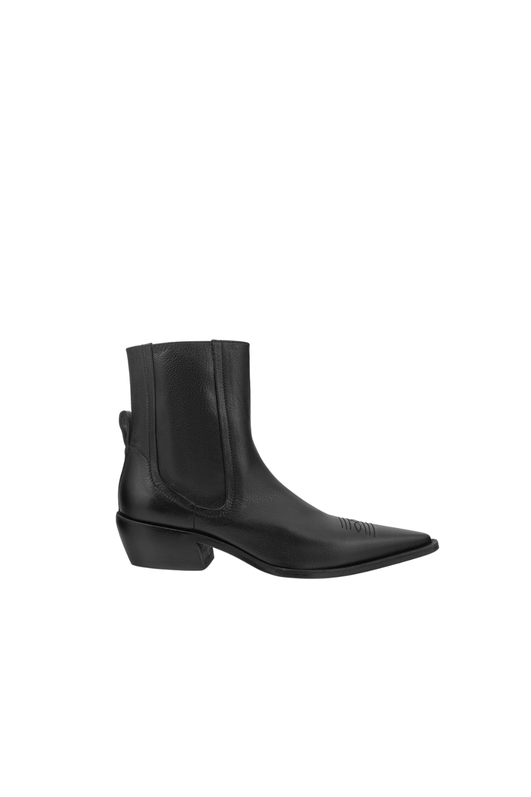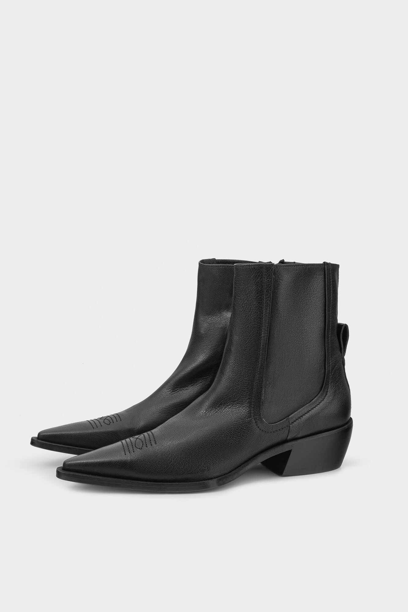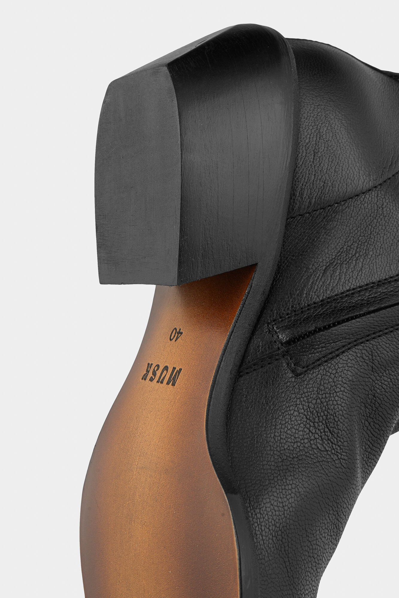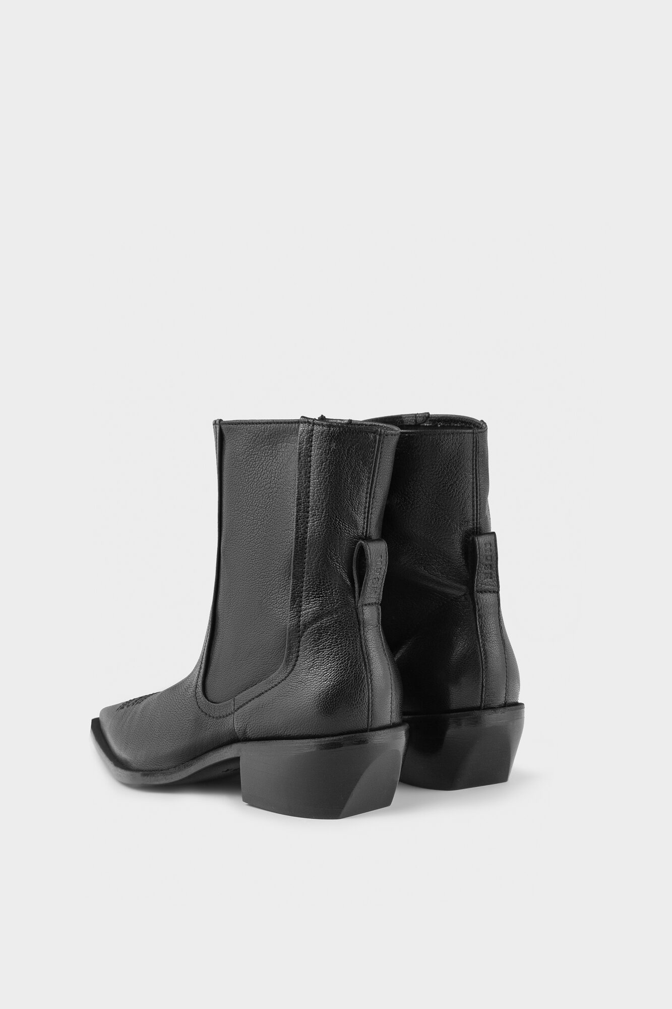Niezwykle miękkie kowbojki za kostkę wykonane z czarnej skóry licowej o wąskiej cholewce. W modelu tym nie zastosowaliśmy podszewki, dzięki czemu kowbojki są bardzo miękkie i niesamowicie lekkie w noszeniu. Wkładka wykonana ze skóry naturalnej. Ozdobne szycie na cholewce imitujące gumę, szlufka z logo marki nad piętą oraz suwak na wewnętrznej stronie cholewki to również elementy wyróżniające ten model względem pozostałych. Stabilny obcas z podciętym tyłem i gruba, w całości skórzana podeszwa dają komfort użytkowania i są niezwykle efektowne. Wydłużony, spiczasty nosek charakterystyczny dla naszej marki oraz doskonały krój cholewki idealnie wysmuklają i wydłużają łydkę. Świetnie komponują się zarówno z jeansami jak i sukienkami czy spódnicami. Noś przez cały rok!