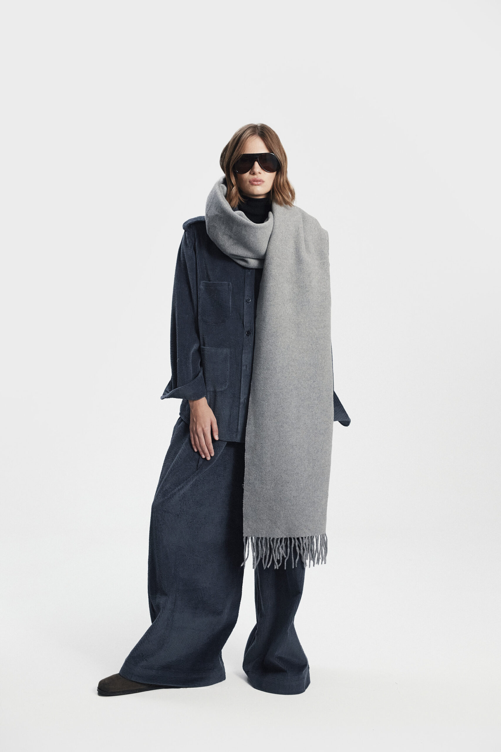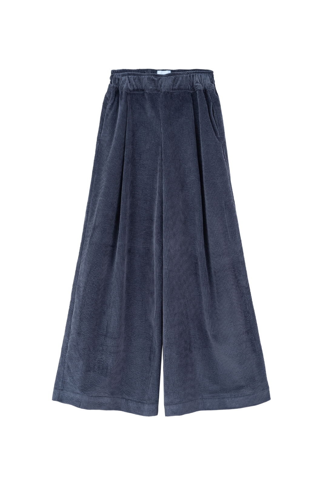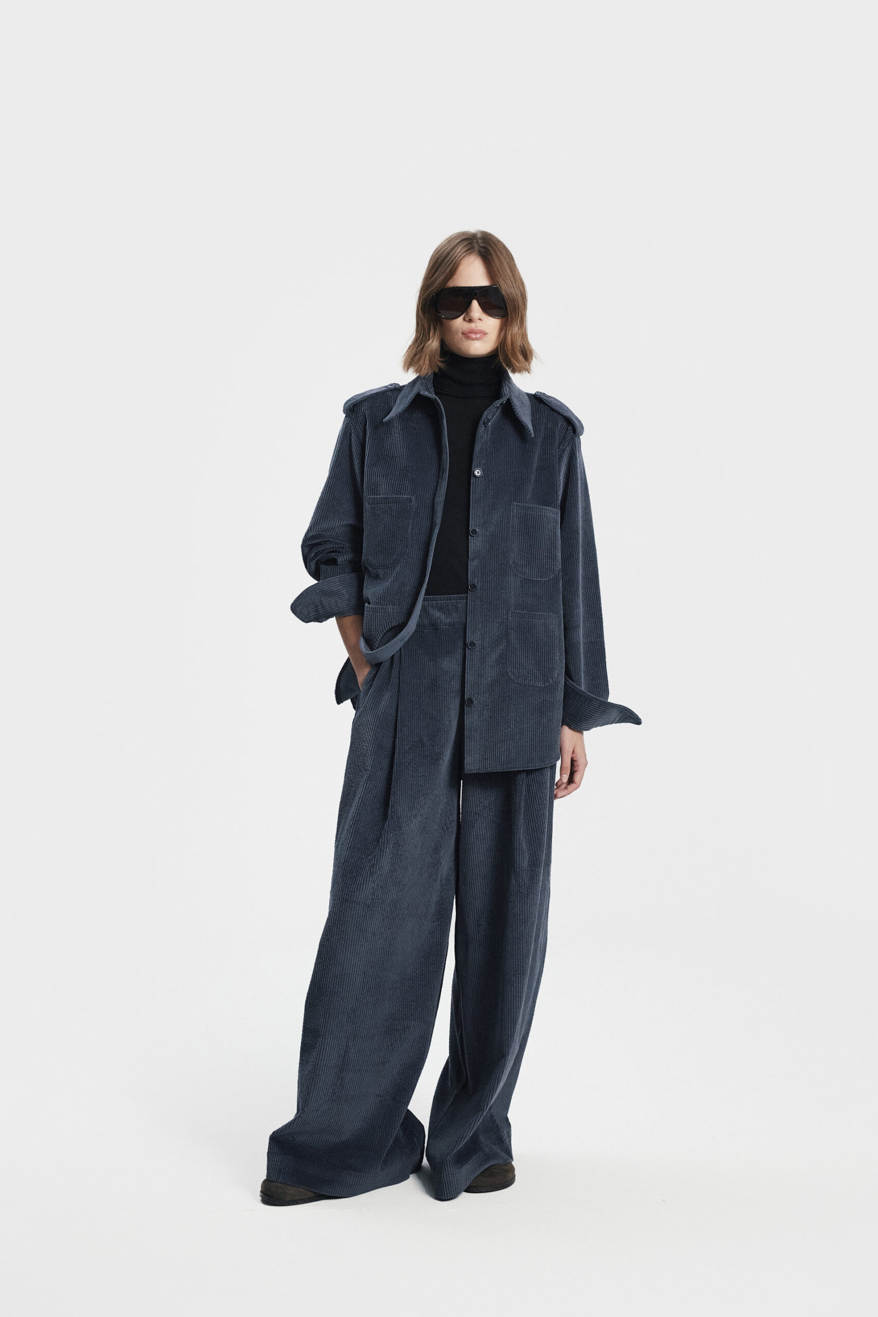 SAPHIRRE PANTS zostały wykonane z miękkiego sztruksu w niebieskim odcieniu. Zaprojektowane z myślą o wygodnej sylwetce z bardzo szerokimi nogawkami, wysokim stanem i elastycznym pasem.