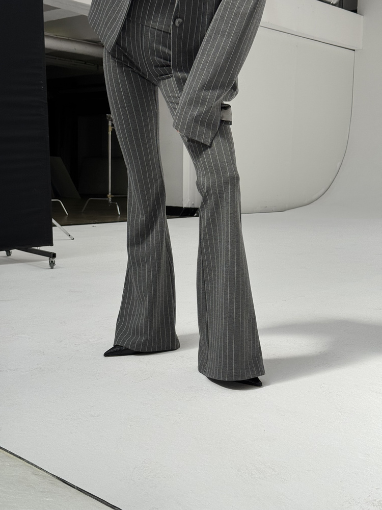 Dopasowane spodnie z wysokim stanem, zapinane na boczny, ukryty zamek. W górnej części subtelnie podkreślają sylwetkę, a ku dołowi delikatnie się rozszerzają, nadając całości efektownych, kobiecych proporcji. Uszyte z miękkiej tkaniny o subtelnym prążkowanym wzorze, łączą elegancję z nowoczesnym charakterem.