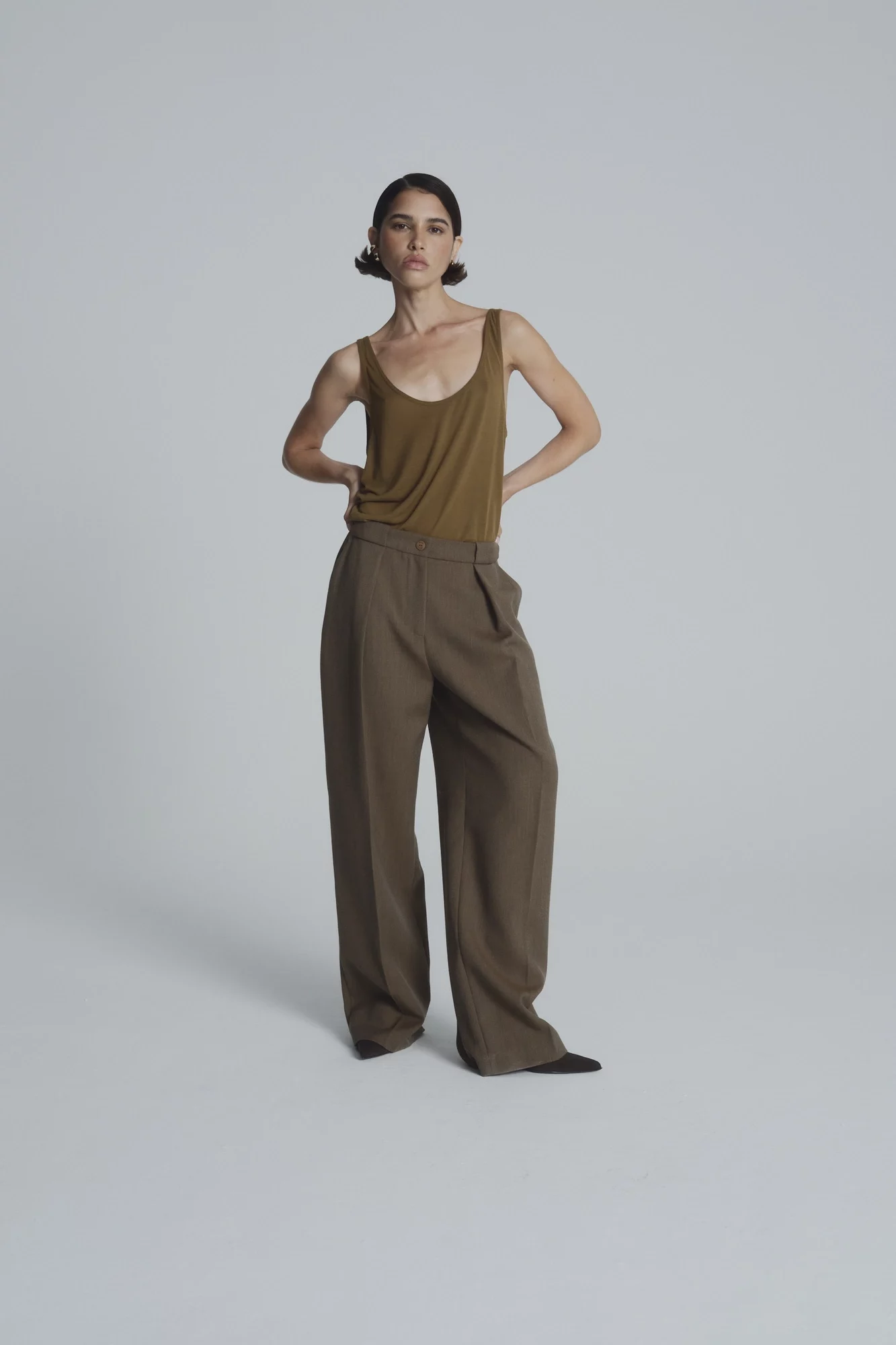 Luźne spodnie inspirowane klasycznym, męskim krawiectwem, uszyte z miękkiej wełny. Charakteryzują się obniżonym stanem, głębokimi zaszewkami oraz prostą, wydłużoną nogawką, która miękko układa się na sylwetce. Wyposażone w szlufki na pasek i boczne kieszenie, łączą w sobie funkcjonalność z wyrafinowaną formą.