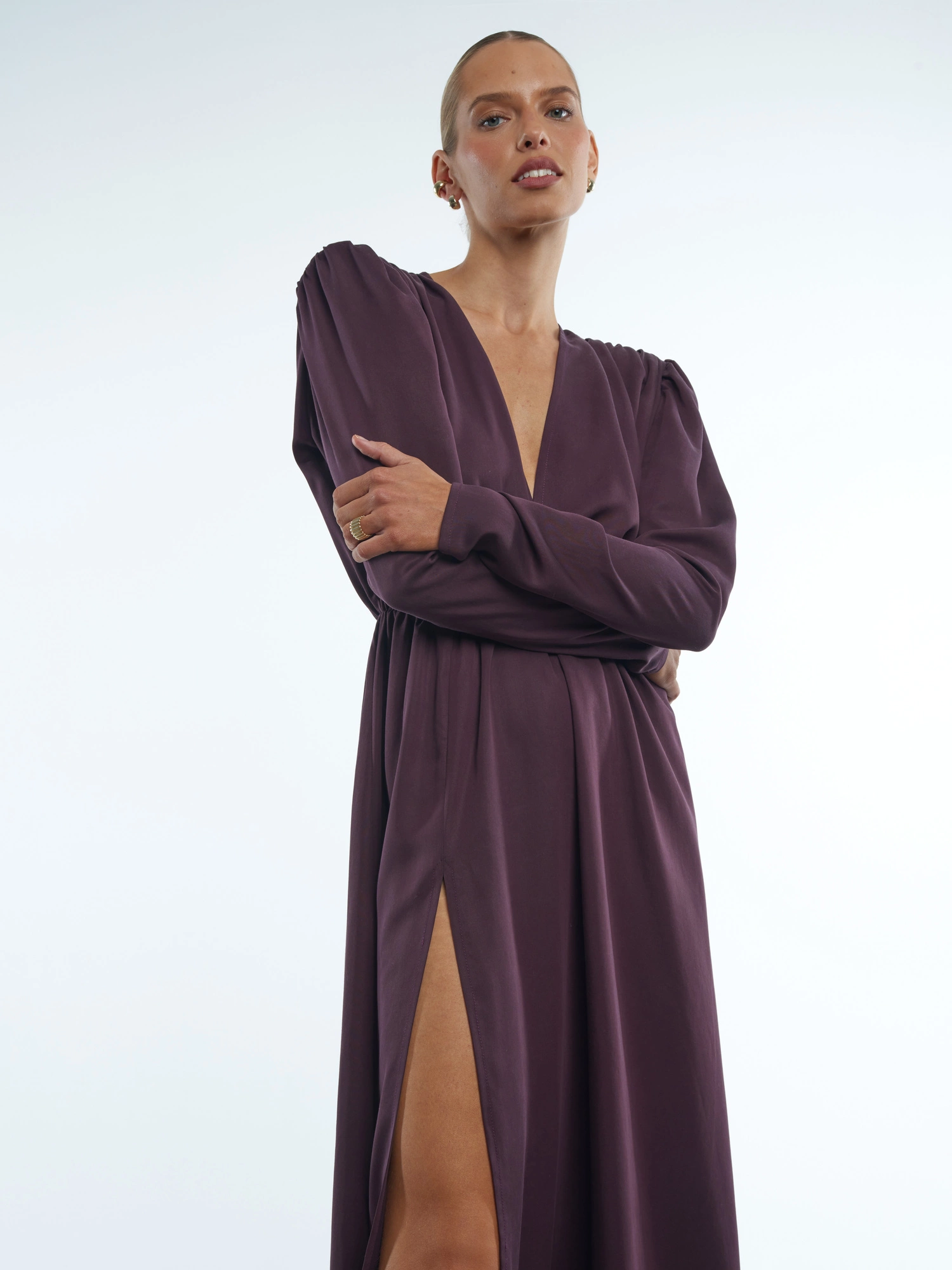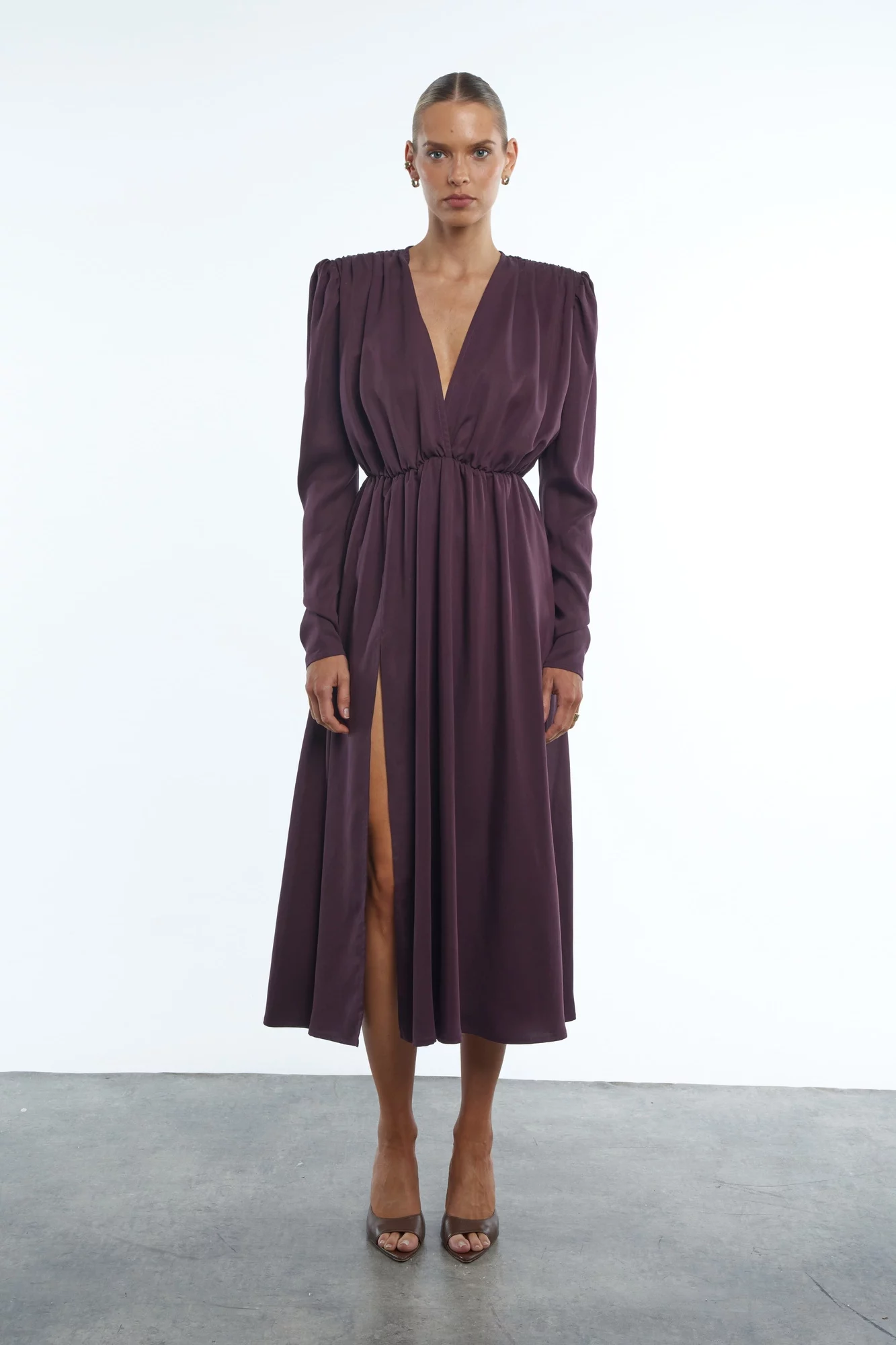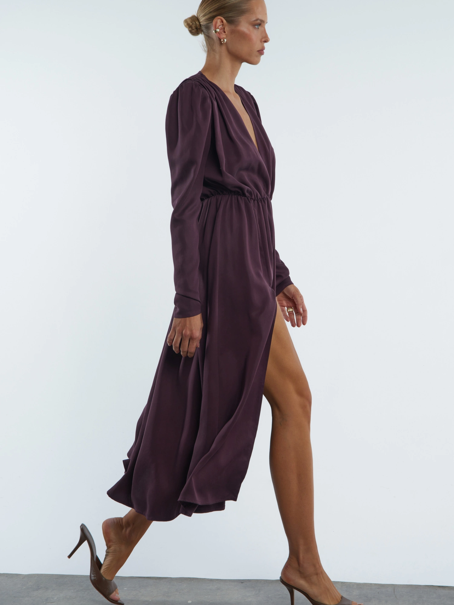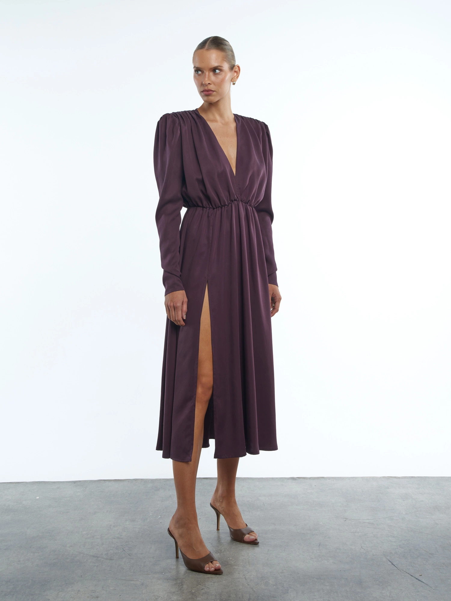 Bestsellerowa sukienka midi wraca w nowej odsłonie. Wykonana z miękkiego lyocellu w pięknym, głębokim odcieniu burgundu. Głęboki dekolt w kształcie litery V zniewalająco eksponuje linię biustu i optycznie wydłuża szyję. Poduszki na ramionach charakterystycznie podkreślają ramiona, a głębokie rozcięcie na udzie przełamuje prostotę i subtelnie eksponuje nogę. Idealnie sprawdzi się w stylizacjach ze szpilkami i bez wątpienia przyciągnie niejedno spojrzenie.