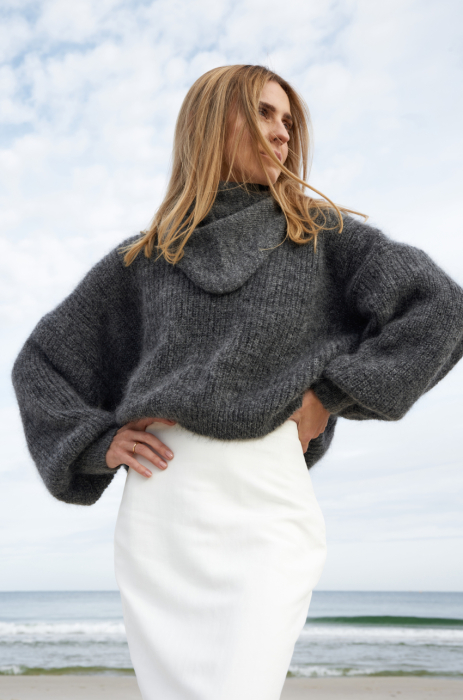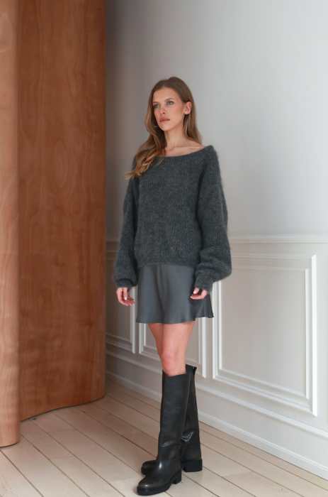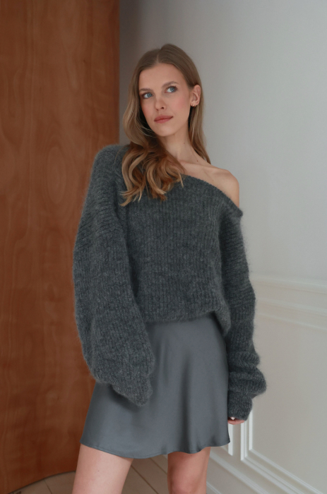 Sweter w kolorze szarym, wykonany z miękkiej, puszystej mieszanki jednego z najbardziej delikatnych gatunków moheru – super kid. Krój oversize, z opuszczoną linią ramion i subtelnym wykończeniem przy dekolcie. W tym modelu, najważniejszym elementem są plecy – głęboko wycięte i wykończone wiązaniem, które pozwala regulować ułożenie swetra.