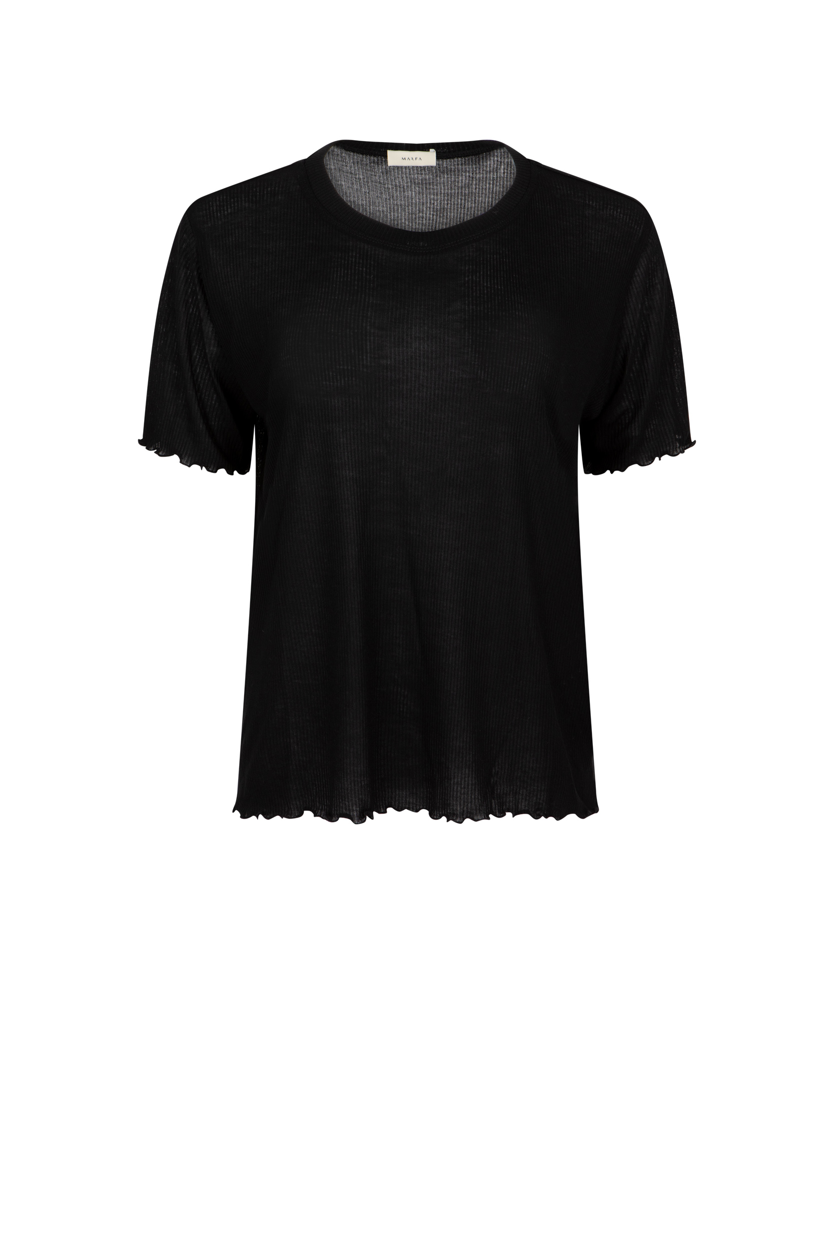Czarny t-shirt wykonany z cienkiej, wyjątkowo delikatnej dzianiny wiskozowej. Subtelna, prążkowana struktura. Rękawy oraz dół wykończone falowanym brzegiem. T-shirt stanowi uniwersalne dopełnienie stylizacji – pasuje zarówno do luźnych stylizacji, jak i tych eleganckich.