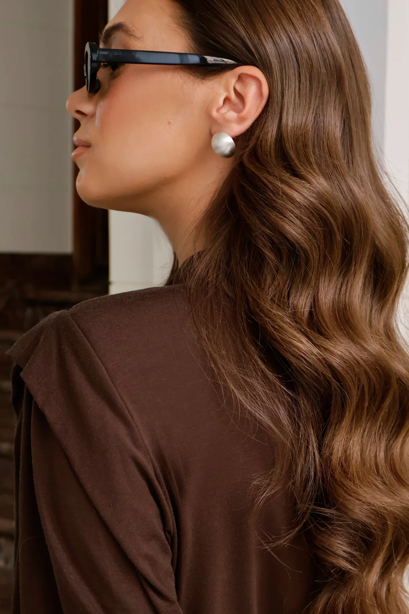 Duże kolczyki sztyfty w stylu vintage o kształcie gładkich półkul. Satynowe, szczotkowane wykończenie. W całości wykonane ze srebra próby 925. Klasyczny model pasujący do każdej stylizacji i okazji.
