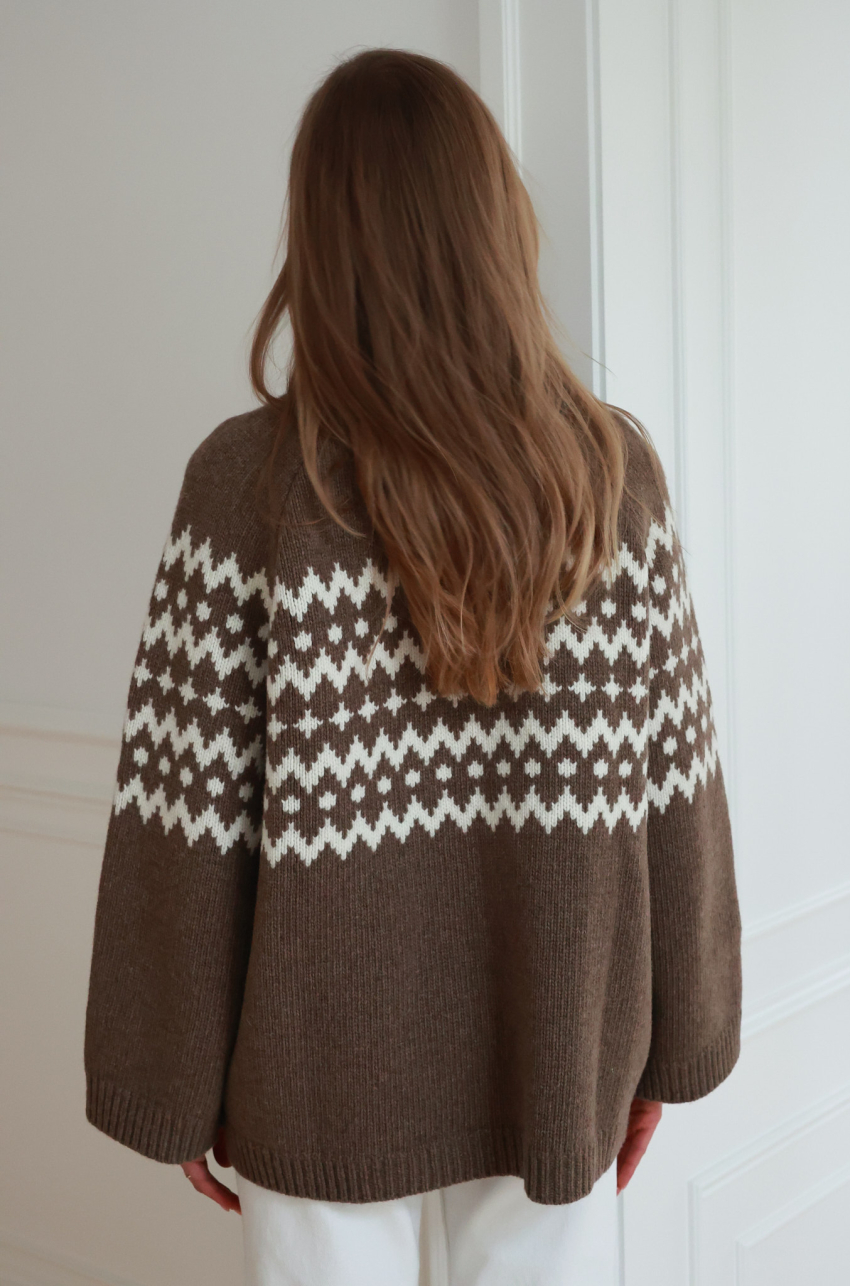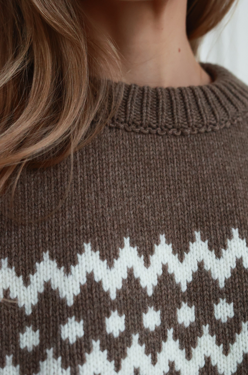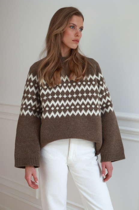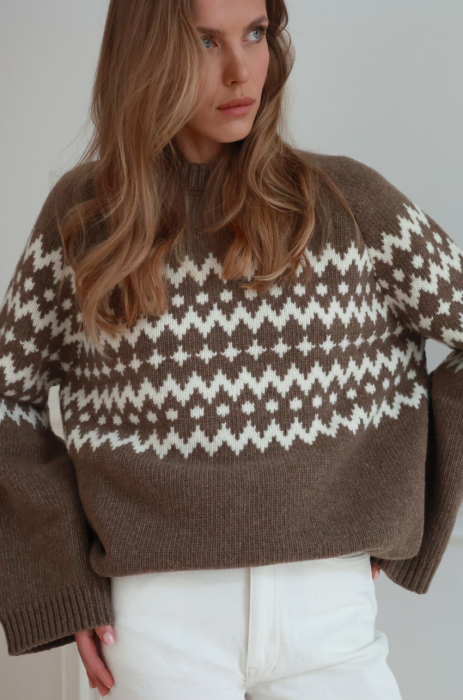 Sweter w kolorze jasnego brązu o pudełkowym kroju z kontrastowym, żakardowym wzorem. Posiada prążkowane wykończenia, raglanowe rękawy i komfortową długość za biodra. Ciepła i miękka przędza z przewagą szlachetnej wełny, zapewnia odpowiednią termoregulację nawet w najbardziej mroźne dni.