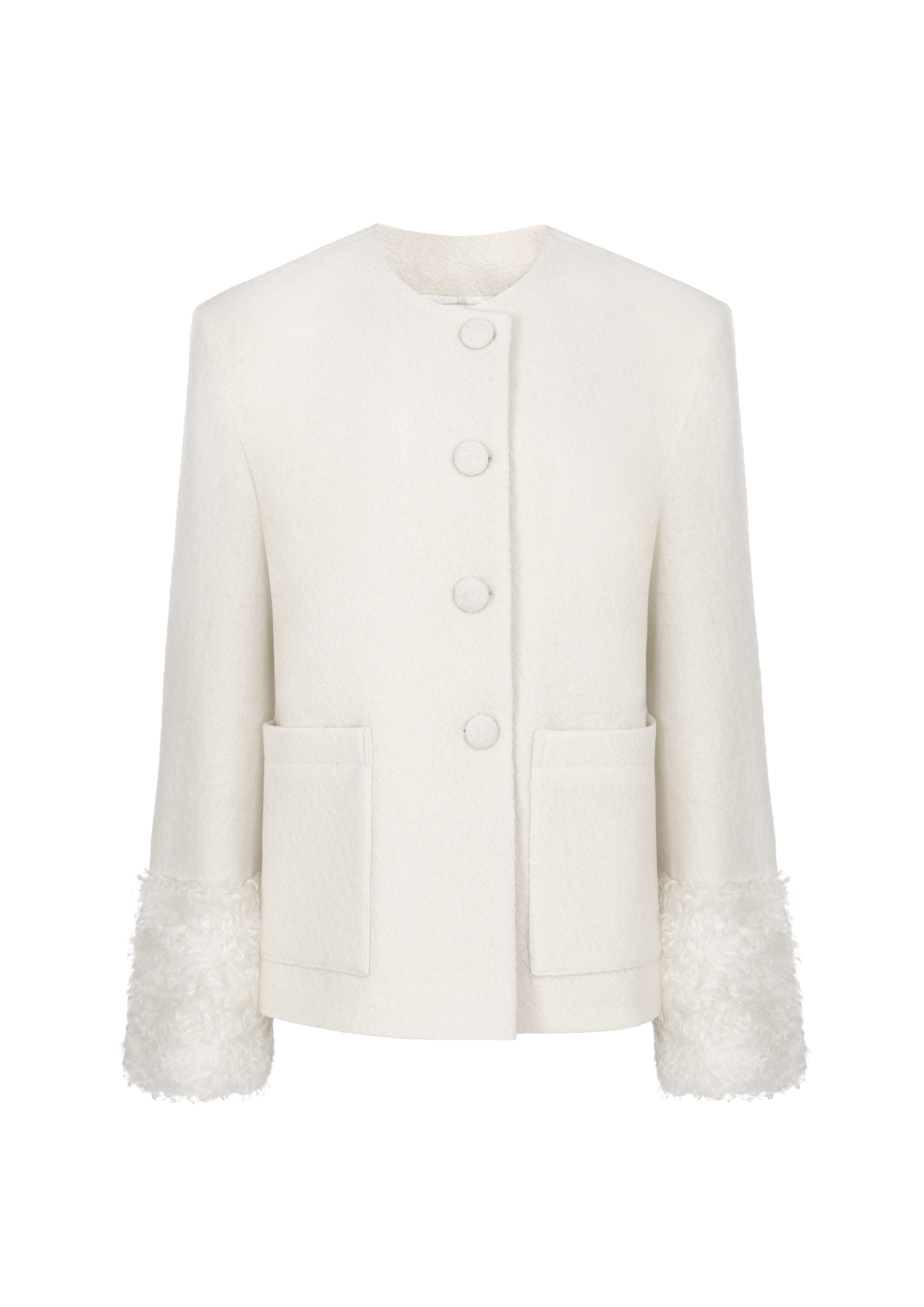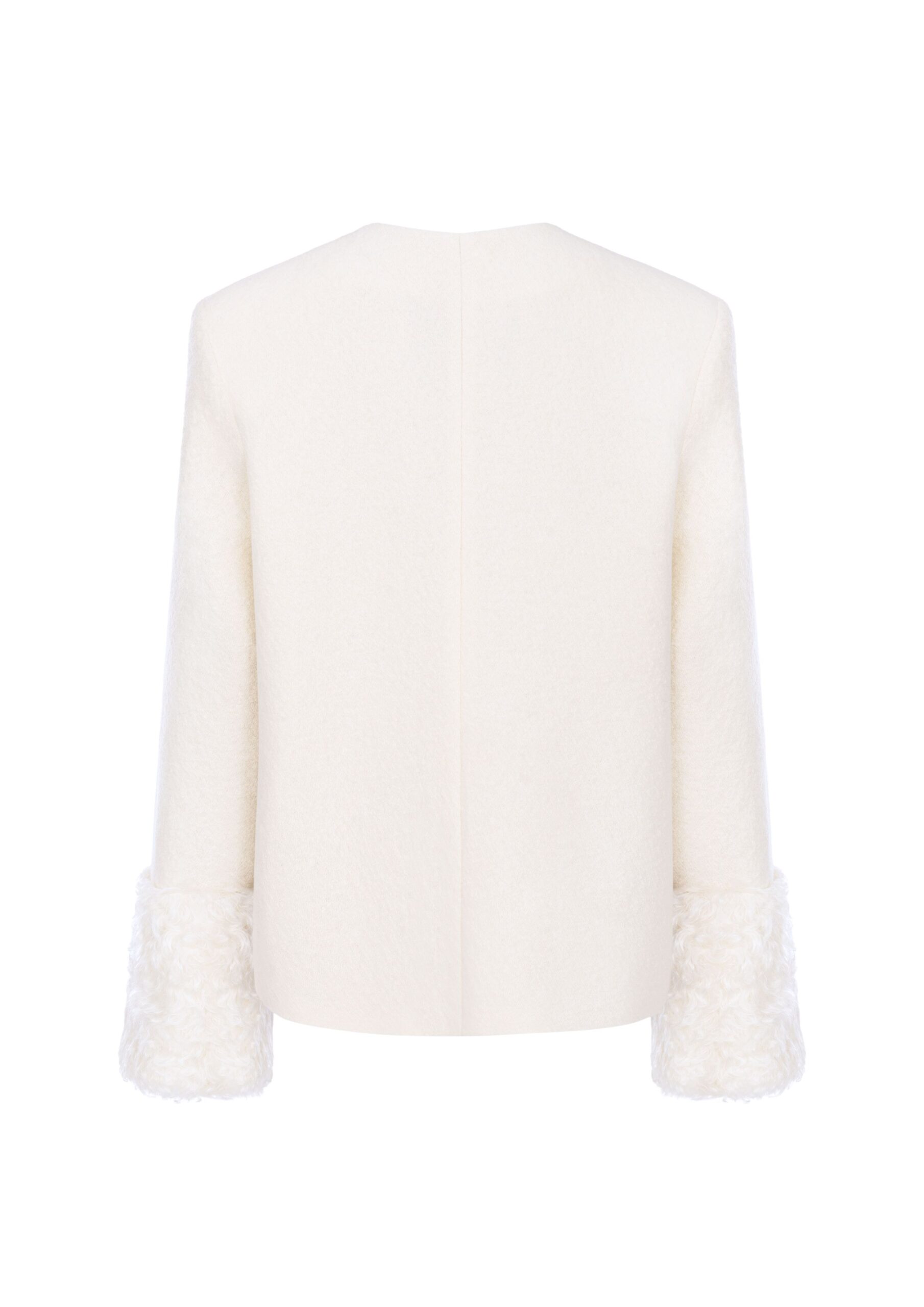 Kwadratowa kurtka bez kołnierza uszyta z miękkiej, kremowej wełny. Wykończona obszyciem z białego futra przy rękawach, które dodaje jej subtelnego, zimowego charakteru. Minimalistyczna forma sprawia, że doskonale uzupełni zarówno eleganckie, jak i codzienne stylizacje.